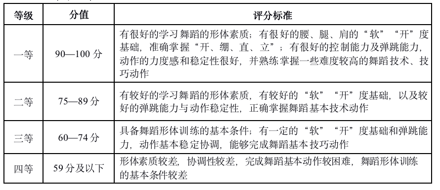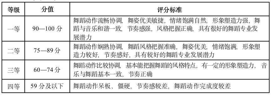 考查考生身体协调性、舞蹈表演基本素质和对舞蹈作品的表现力,要求考生能够准确把握舞蹈作品基本韵律和风格特点,具备学习舞蹈的身体素质、技术、情感和形象塑造能力。