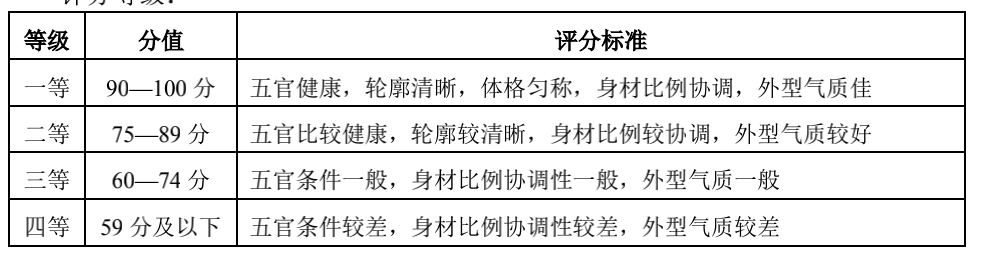 考查要素:①五官;②身材;③形象;④气质。要求身材匀称、比例协调,五官健康正常,气质较好,大方得体,生理心理状态稳定。