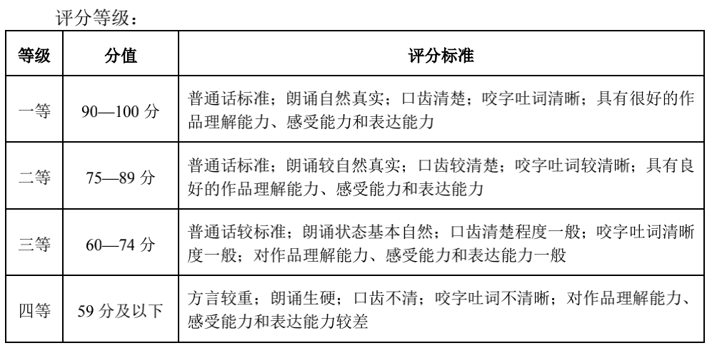 通过考生的朗诵,考查考生的声音条件和语言的规范程度,对作品思想内容的理解能力,对作品意境、情感的把握能力,对所塑造人物形象的感受能力和表现能力。