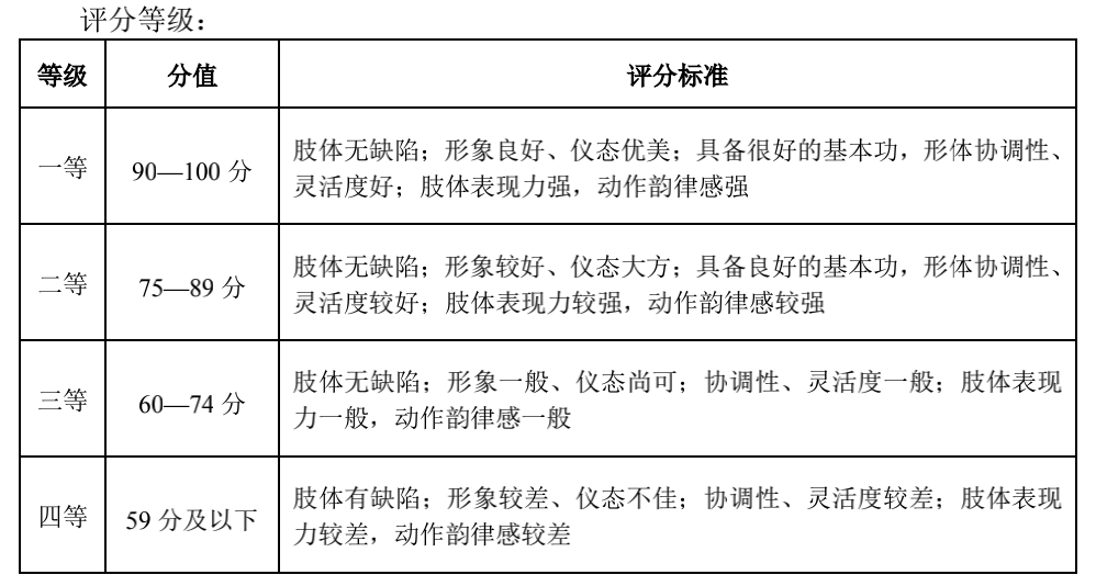 考生表演自选舞蹈、戏曲身段、武术、体操等形体片段均可,考试时间2分钟以内。