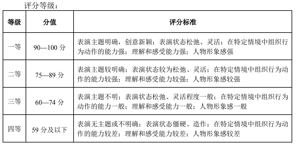 考查考生能否建立适当的环境和人物关系,明确各自的角色和任务,能进行良好的互动并能很快地适应不断变化的情境。按照生活逻辑展开合理的艺术想象,准确、生动、富于创意地演绎主题。