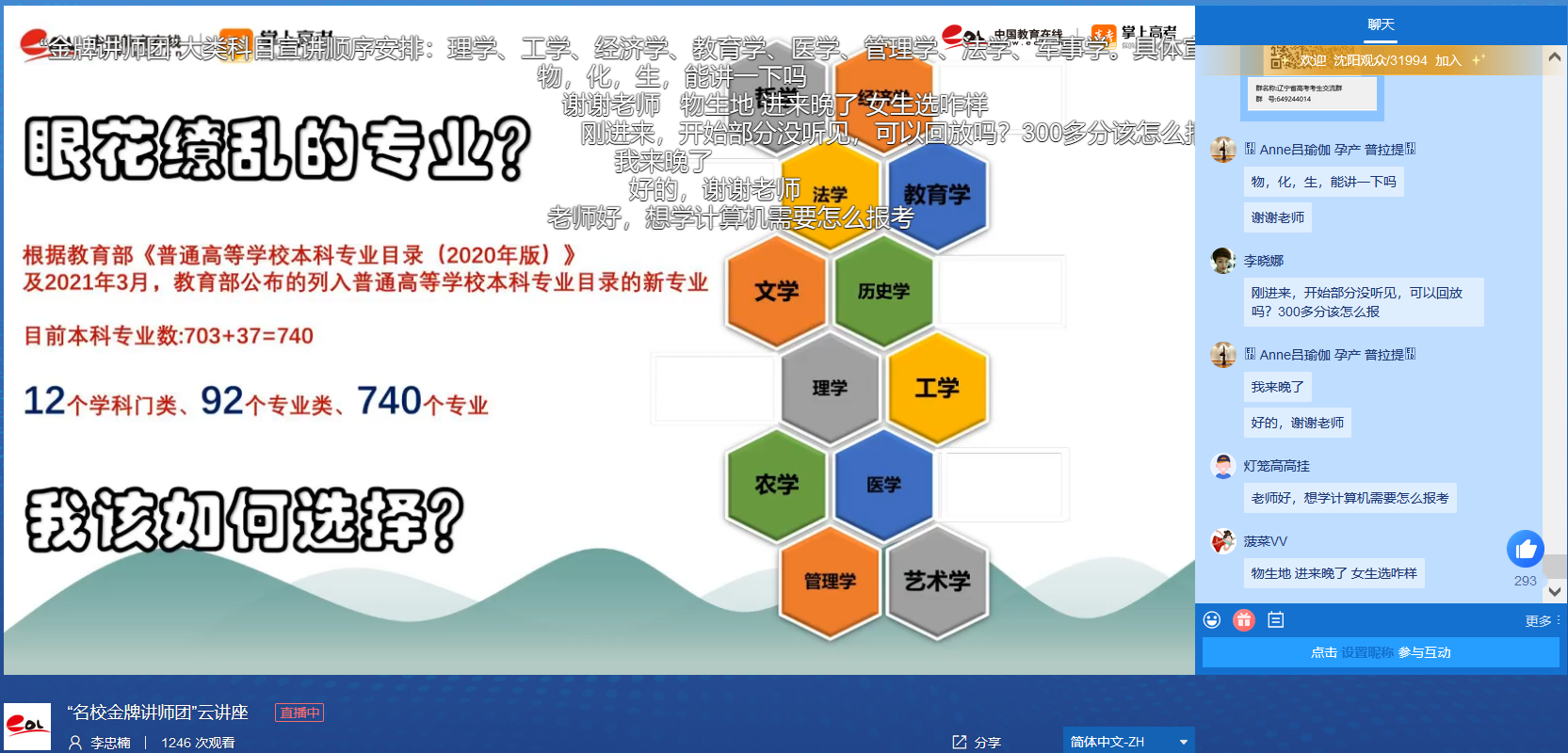 11月17日,由中国教育在线·掌上高考组织的辽宁省“金牌讲师团”第一期公益助考活动如期举行,本期宣讲活动持续一个小时,累计观看次数6346次,点赞评论3200余次,共有来自辽宁省内的大连市第三十六中学、大连市第二十三中学、抚顺市第十二高级中学等30余所高中的学生、家长在线观看参与讨论。