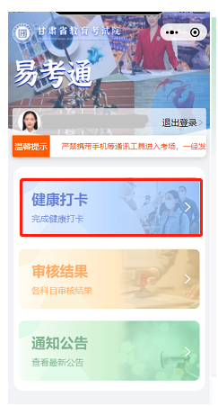 4.考前17天起,考生主动申领“健康码”和“行程卡”,并持续关注“健康码”和“行程卡”的状态。考生本人每天均须登录“甘肃教育考试易考通”微信小程序进行健康打卡,健康打卡时会通过人脸及身份证识别方式对考生身份进行验证,并自动获取考生所处地理位置以检测考生是否在甘肃省内,考生要针对健康打卡提前做好准备。