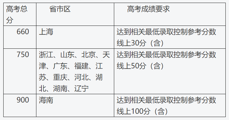 1.尚未实行高考综合改革的省(区、市):不低于我校在生源省(区、市)本科第一批次最终模拟投档线下20分(含),且不低于第一批次录取控制分数线(合并批次省份为相应省级招生考试机构所确定的最低录取参考控制分数线)。
