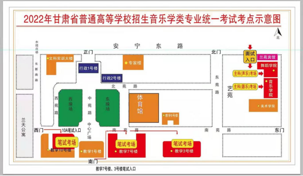 为做好新冠疫情防控工作,确保考生顺利入场,考生须按照规定的出入口及路线出入相应考点。考生应提前在考点门口排队,预留足够时间配合考点工作人员进行入场核验。具体路线见《2022年甘肃省普通高校招生音乐学类专业统一考试考点示意图》。