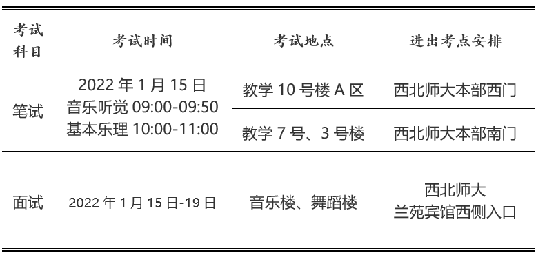 一、考试科目及时间、地点总分满分为300分,三科(主科、音乐听觉、基本乐理)成绩均按百分制计分。其中主科成绩占70%,音乐听觉成绩占20%,基本乐理成绩占10%。总分计分办法:总分=(主科成绩×70%+音乐听觉成绩×20%+基本乐理成绩×10%)×3。二、考生须知(一)考生于2022年1月12日10:00起登录甘肃省教育考试院网站普通高校招考智慧平台,打印《报名登记表》。(二)考生凭艺术体育类专业考试准考证、身份证、《报名登记表》,按照规定的出入口及路线(详见考场分布及考生入场安排表、考点示意图)进出相应