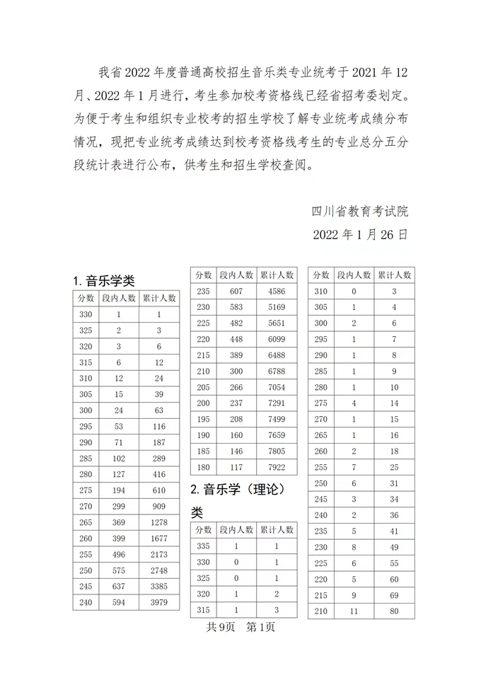 四川省2022年普通高校招生音乐类专业统考与2021年12月、2022年1月进行,考生参加校考资格线已经省招考委划定。为便于考生和组织专业校考的招生学校了解专业统考成绩分布情况,现把专业统考成绩达到校考资格线的考生的专业总分五分段统计表进行公布,供考生和招生学校查阅。