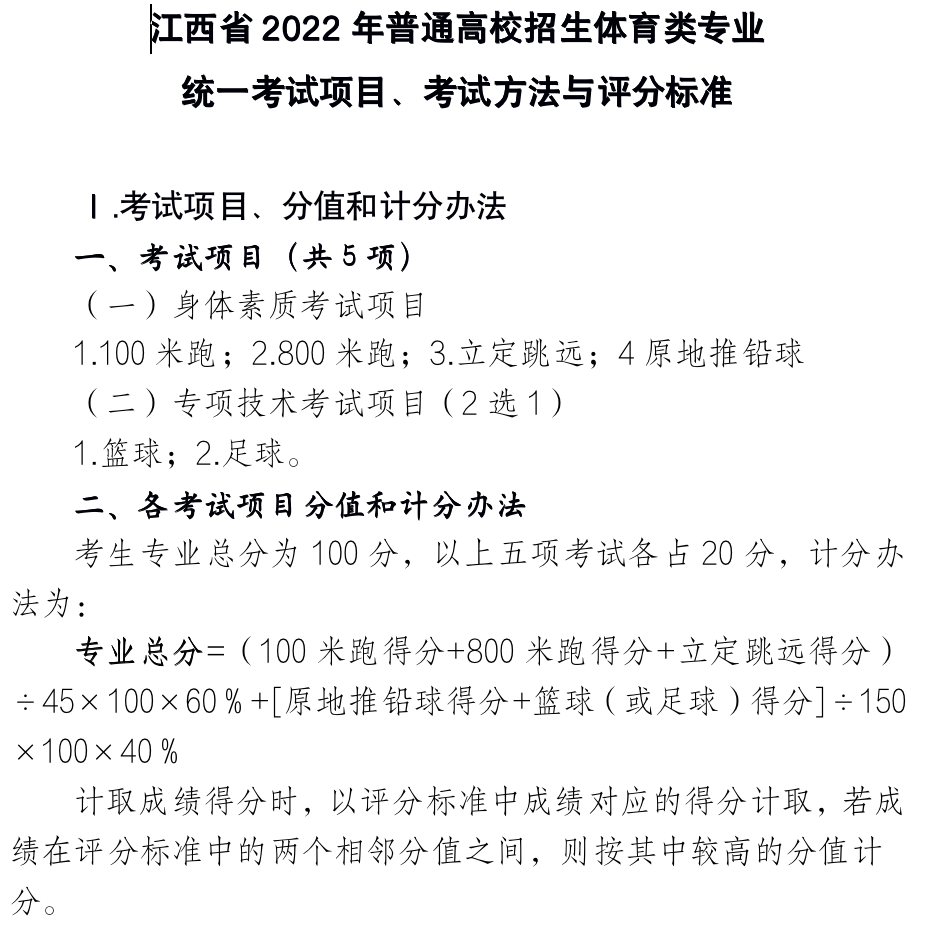 江西省2022年普通高校招生体育类专业统一考试项目、考试方法与评分标准