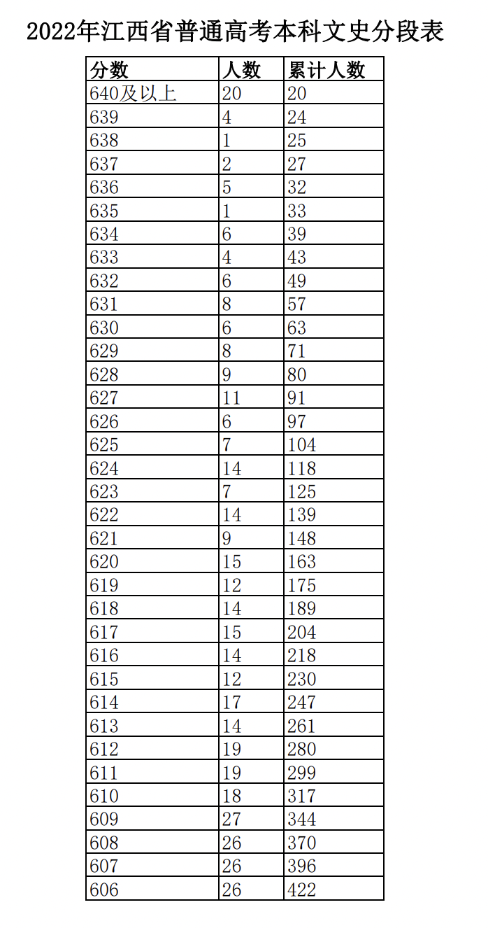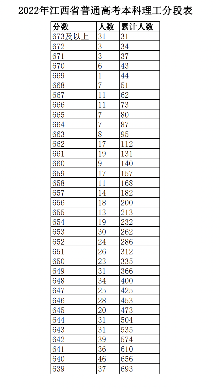 江西省2022年普通高考分段表公布:点击链接查看完整版分段表: