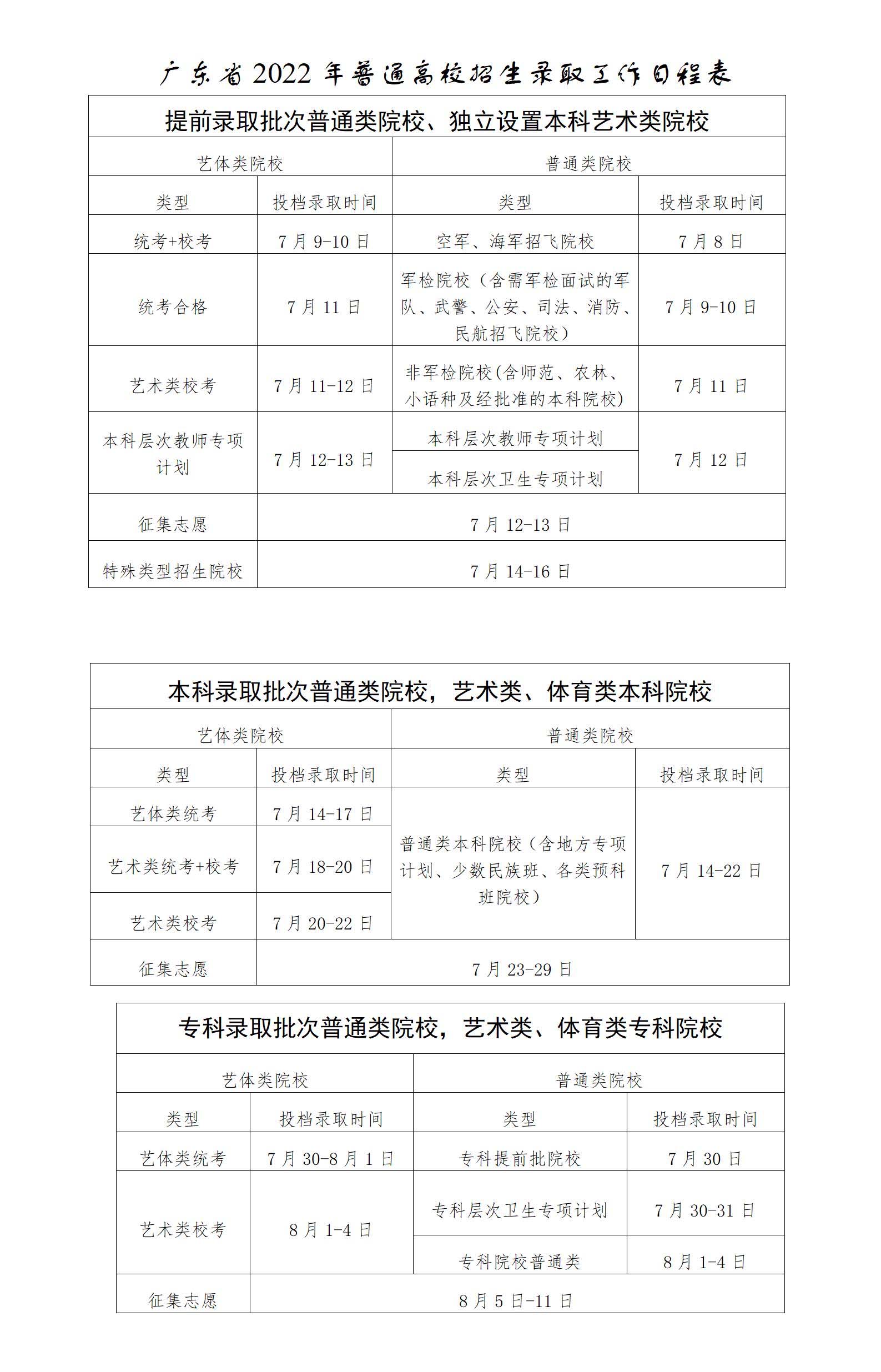 广东省2022年高考志愿填报工作已经顺利结束,招生录取工作将于7月8日至8月11日进行。其中,提前批为7月8日至16日,本科批为7月14日至29日,专科批为7月30日至8月11日。工作日程后续如有调整,请以省教育考试院官微官网的最新通知为准。录取期间,广东省教育考试院将通过官微官网公布首次投档情况、征集志愿办法、征集志愿投档情况等考生应知尽知的信息;同时,每天将前一天已录取考生信息通过考生报名时绑定的手机号推送给考生,考生也可以通过广东省教育考试院官微小程序等途径查询录取结果。请广大考生、家长密切关注广东