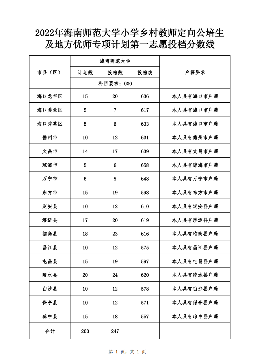 海南2022年海南师范大学小学乡村教师定向公培生及地方优师专项计划第一志愿投档分数线