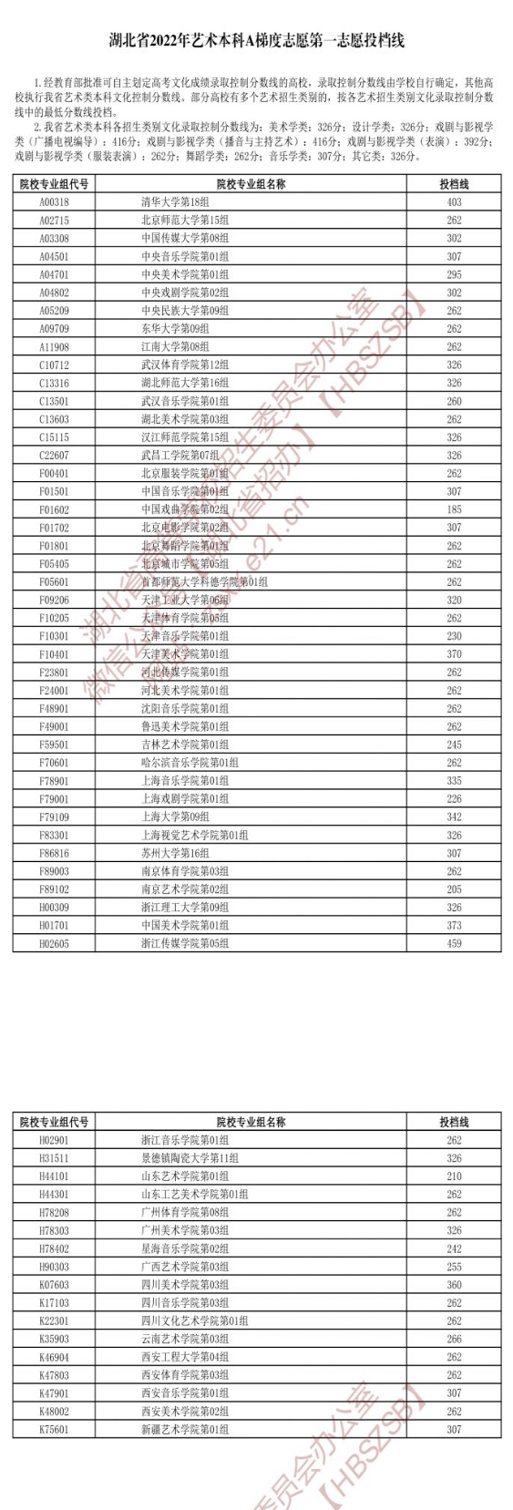 湖北省2022年艺术本科A梯度志愿第一志愿投档线
