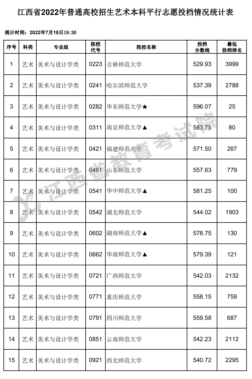 江西省2022年普通高校招生艺术本科平行志愿投档情况统计表公布!