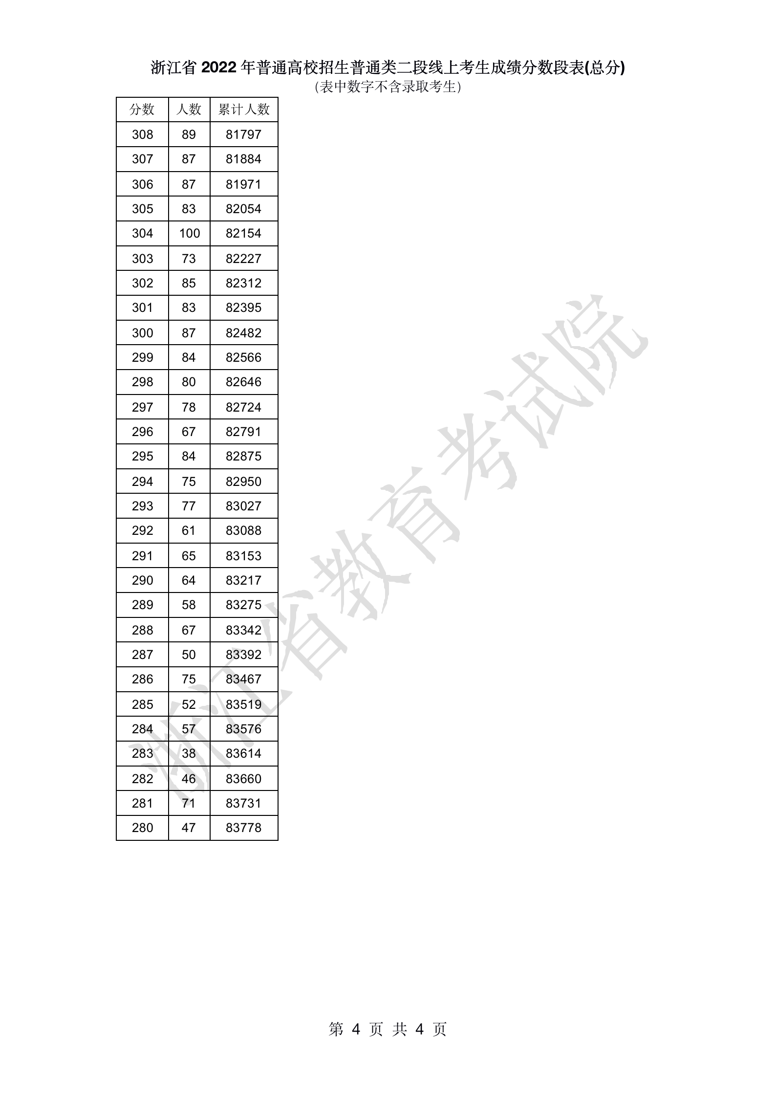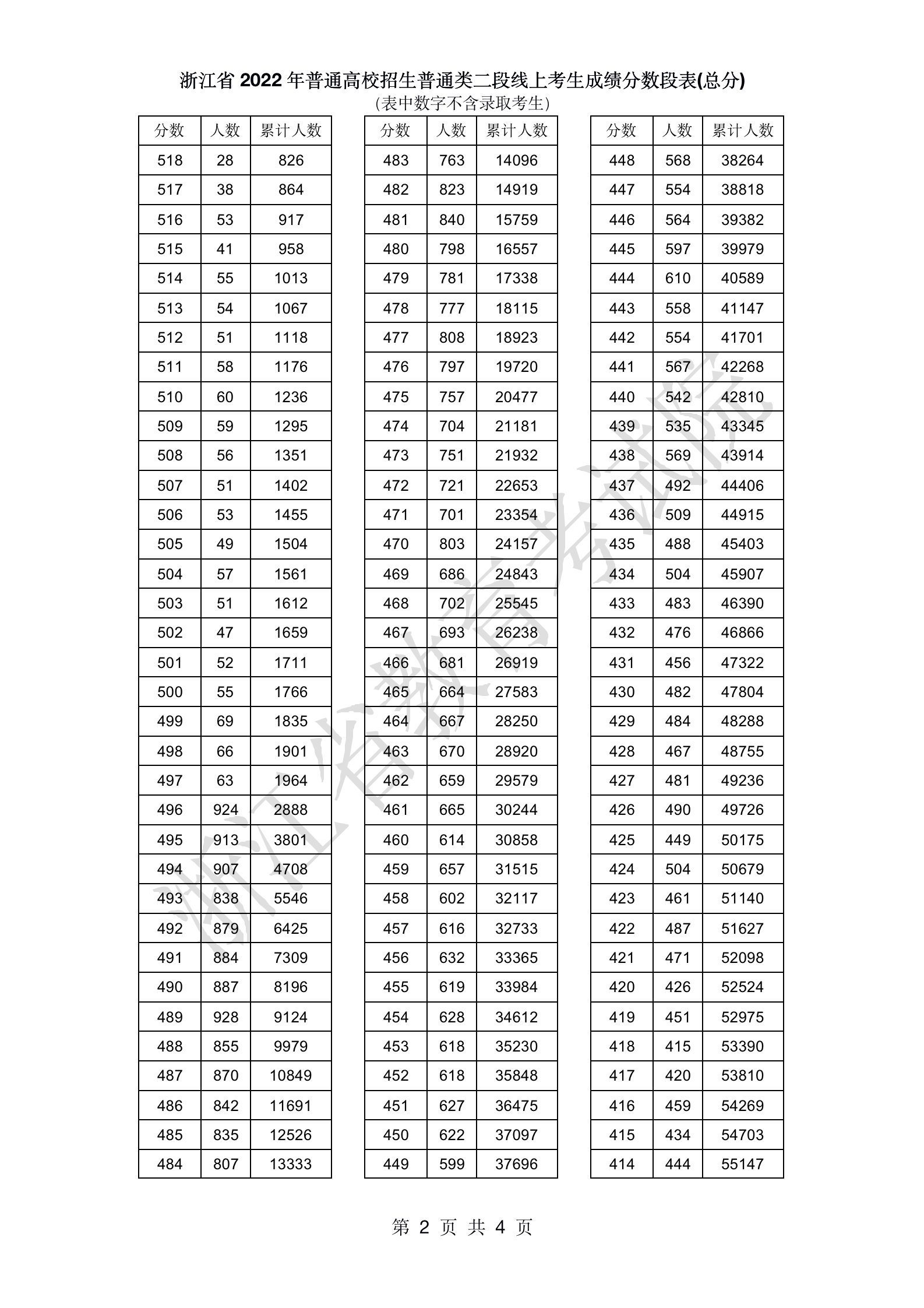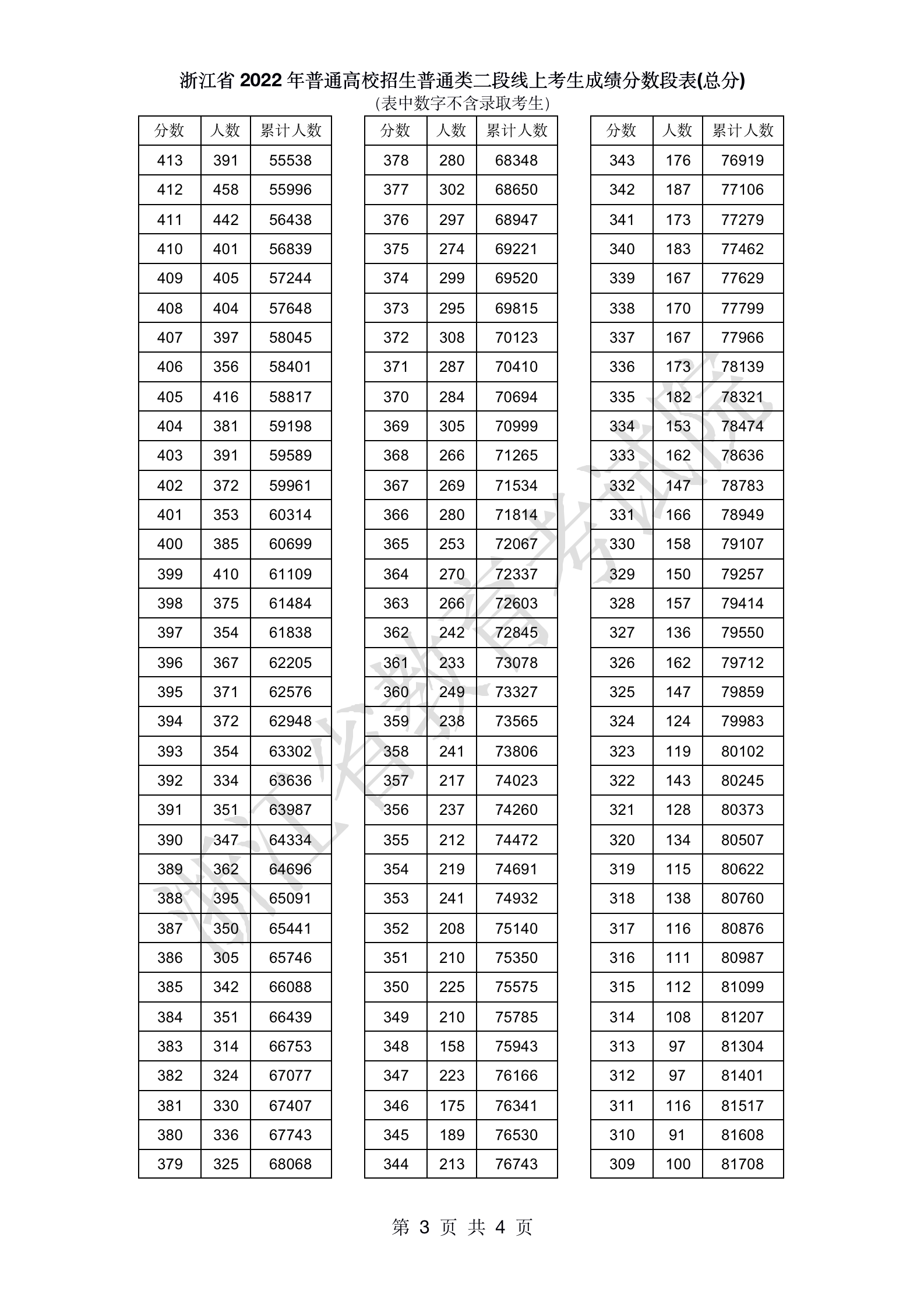 浙江省2022年普通高校招生普通类二段线上考生成绩分数段表(总分)