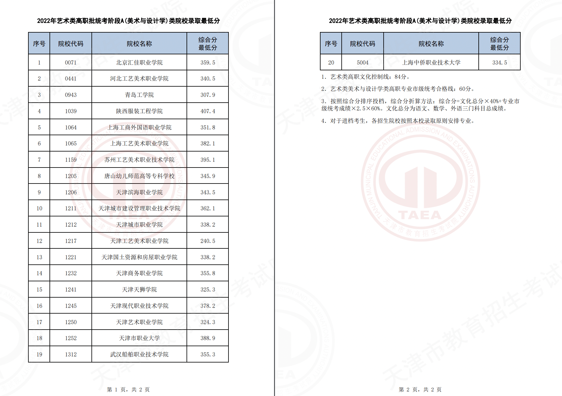 天津市2022年普通高校招生艺术类、体育类及普通类提前高职(专科)批次录取工作已结束。8月3日下午14时起,考生可以通过登录招生院校网站、招考资讯网(www.zhaokao.net)、中国建设银行APP、招商银行APP等途径查询录取结果。以下是天津市2022年普通高校招生艺术类、体育类及普通类提前高职(专科)批次投档最低分:附件:2022年艺术类高职批统考阶段A(美术与设计学)类院校录取最低分