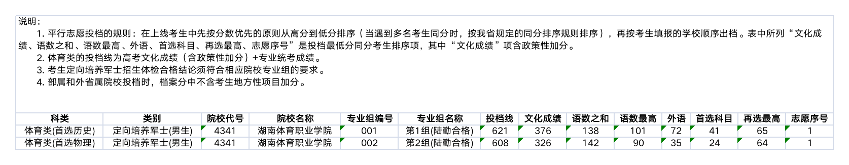 湖南2022专科提前批(体育类定向培养军士)投档分数线1.平行志愿投档的规则:在上线考生中先按分数优先的原则从高分到低分排序(当遇到多名考生同分时,按我省规定的同分排序规则排序),再按考生填报的学校顺序出档。表中所列“文化成绩、语数之和、语数最高、外语、首选科目、再选最高、志愿序号”是投档最低分同分考生排序项,其中“文化成绩”项含政策性加分。2.体育类的投档线为高考文化成绩(含政策性加分)+专业统考成绩。3.考生定向培养军士招生体检合格结论须符合相应院校专业组的要求。4.部属和外省属院校投档时,档案分中不
