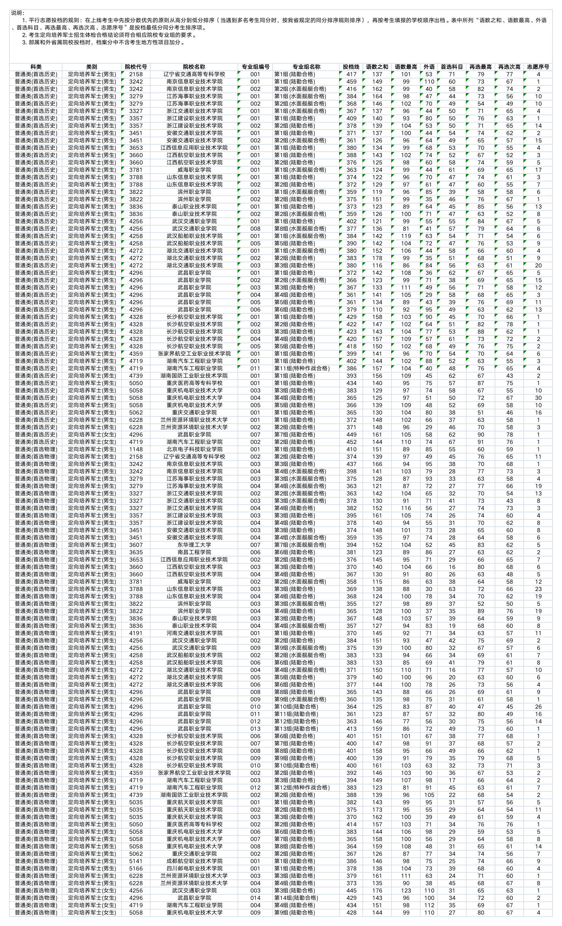 1. 平行志愿投档的规则:在上线考生中先按分数优先的原则从高分到低分排序(当遇到多名考生同分时,按我省规定的同分排序规则排序),再按考生填报的学校顺序出档。表中所列“语数之和、语数最高、外语、首选科目、再选最高、再选次高、志愿序号”是投档最低分同分考生排序项。
