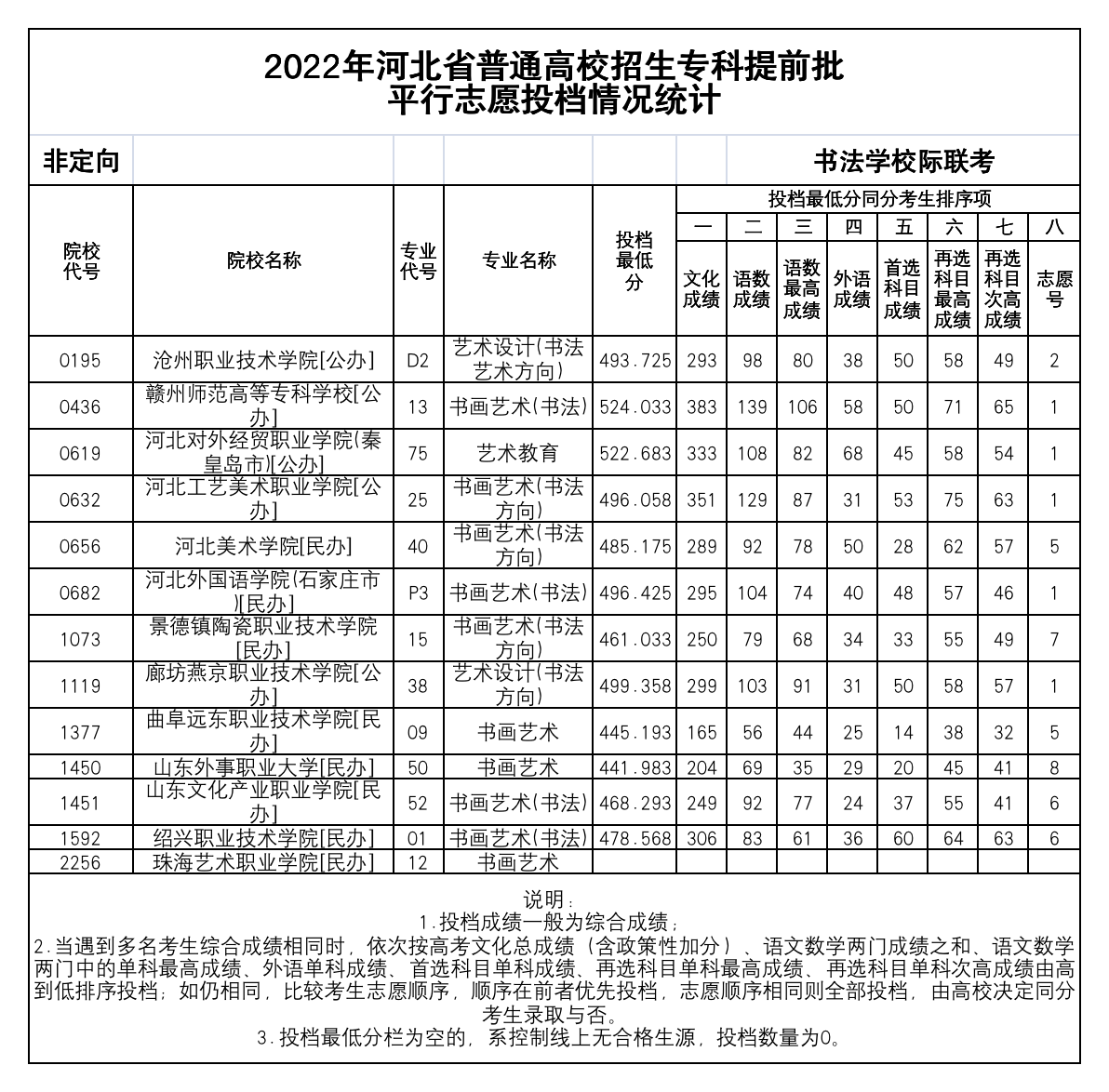 2022年河北省专科提前批、对口专科批平行志愿投档情况统计如下:点击链接下载:2022年专科提前批-美术统考平行志愿投档情况统计