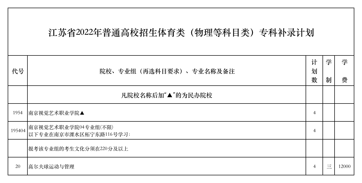 江苏省2022年普通高校招生体育类(物理等科目类)专科补录计划