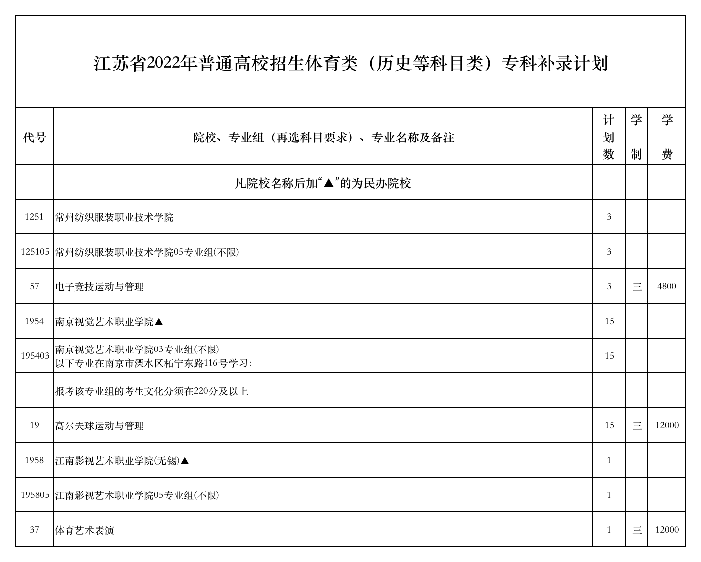 江苏省2022年普通高校招生体育类(历史等科目类)专科补录计划