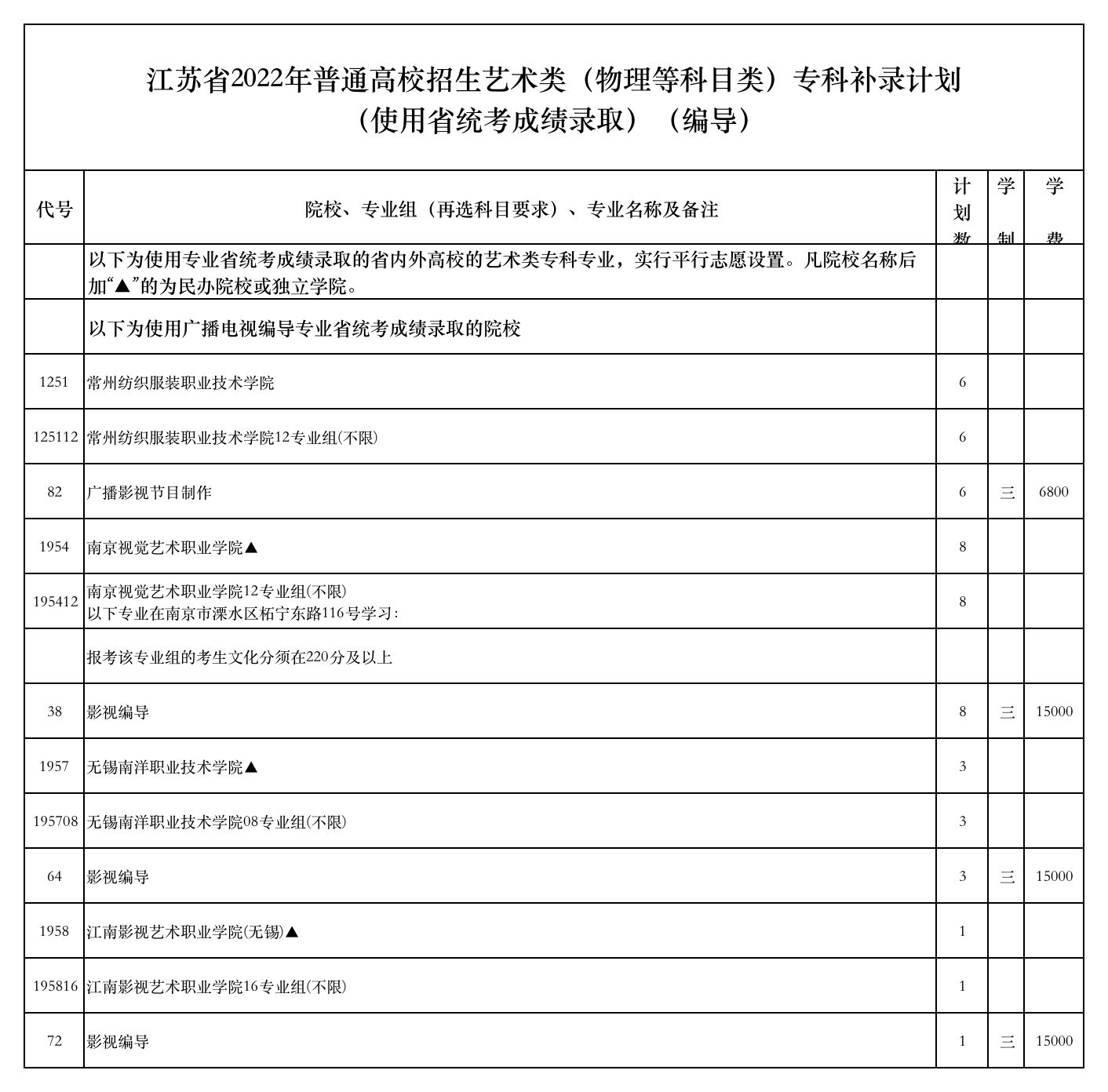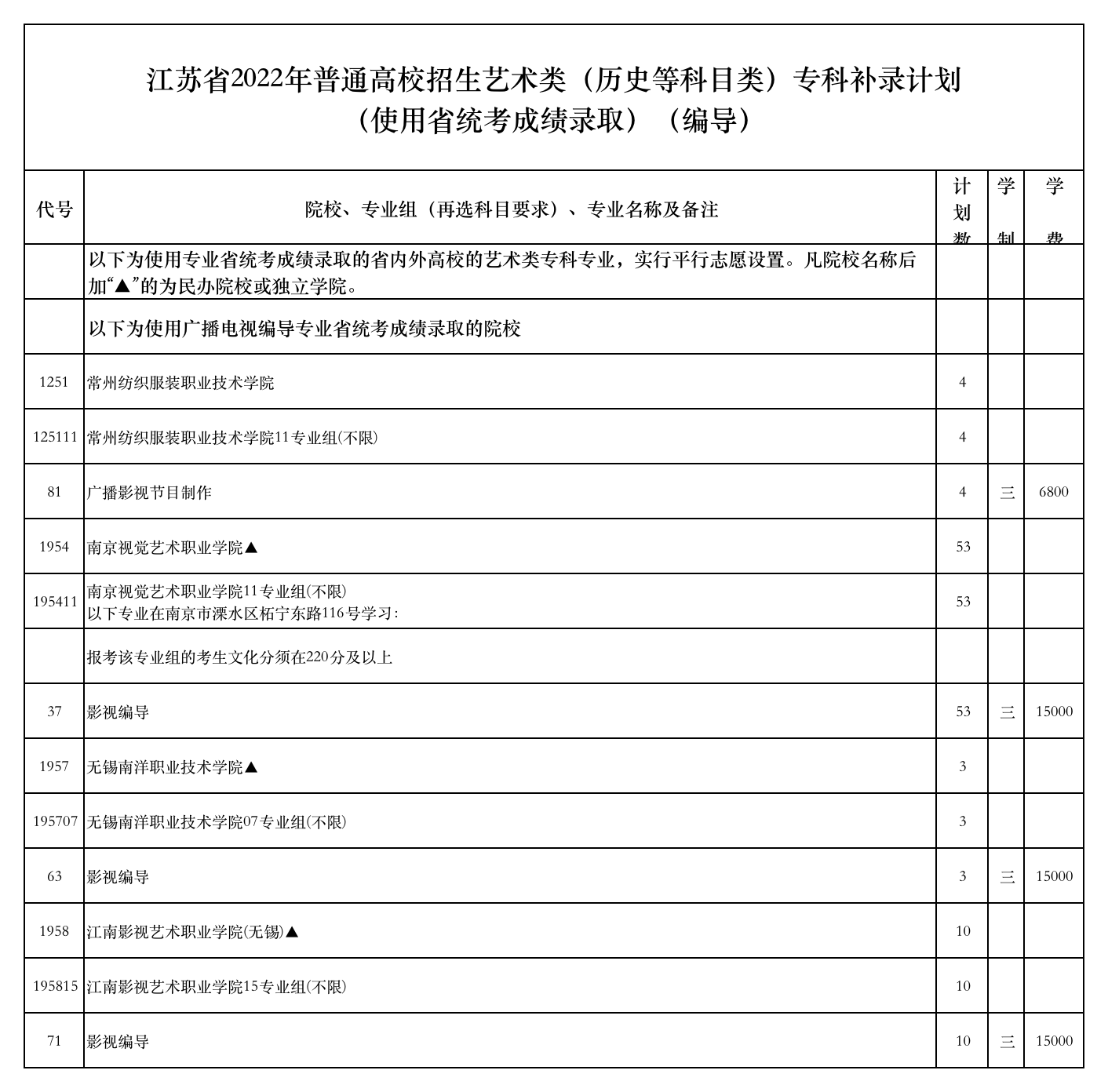 江苏省2022年普通高校招生艺术类(历史等科目类)专科补录计划(使用省统考成绩录取)(编导)