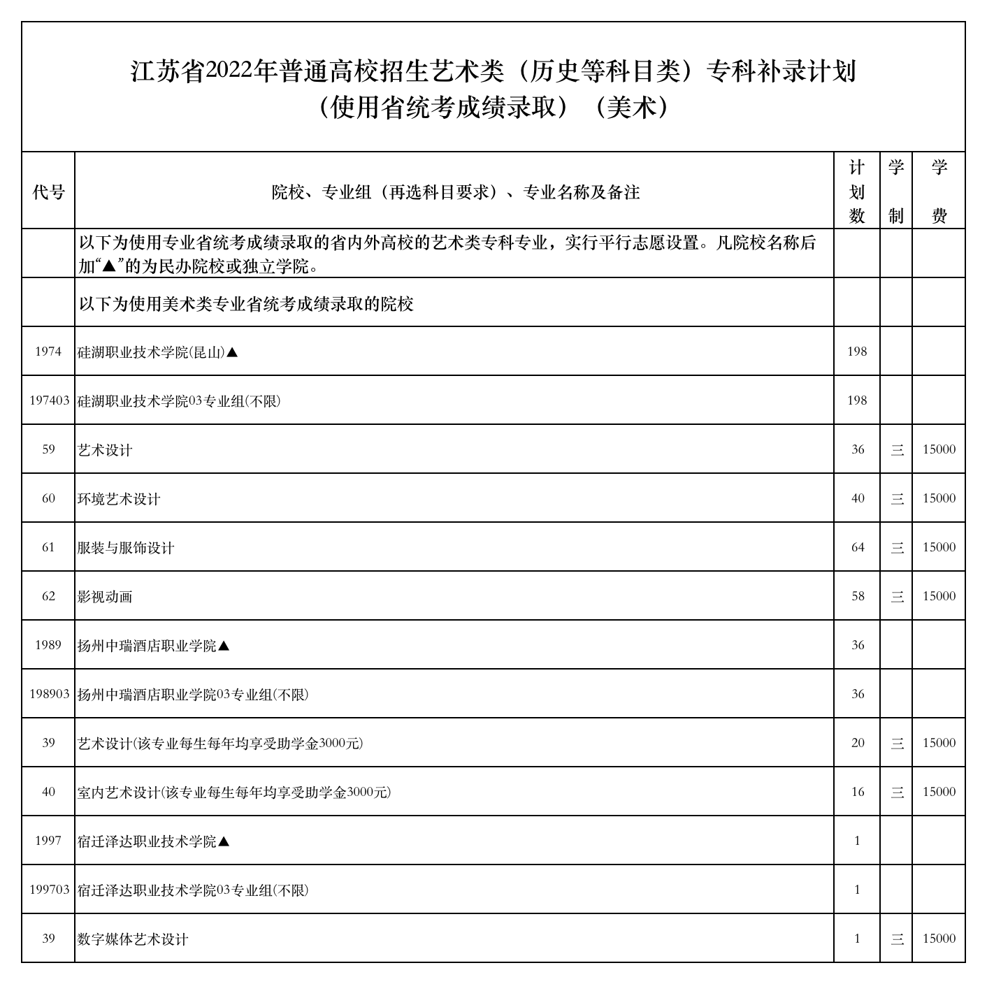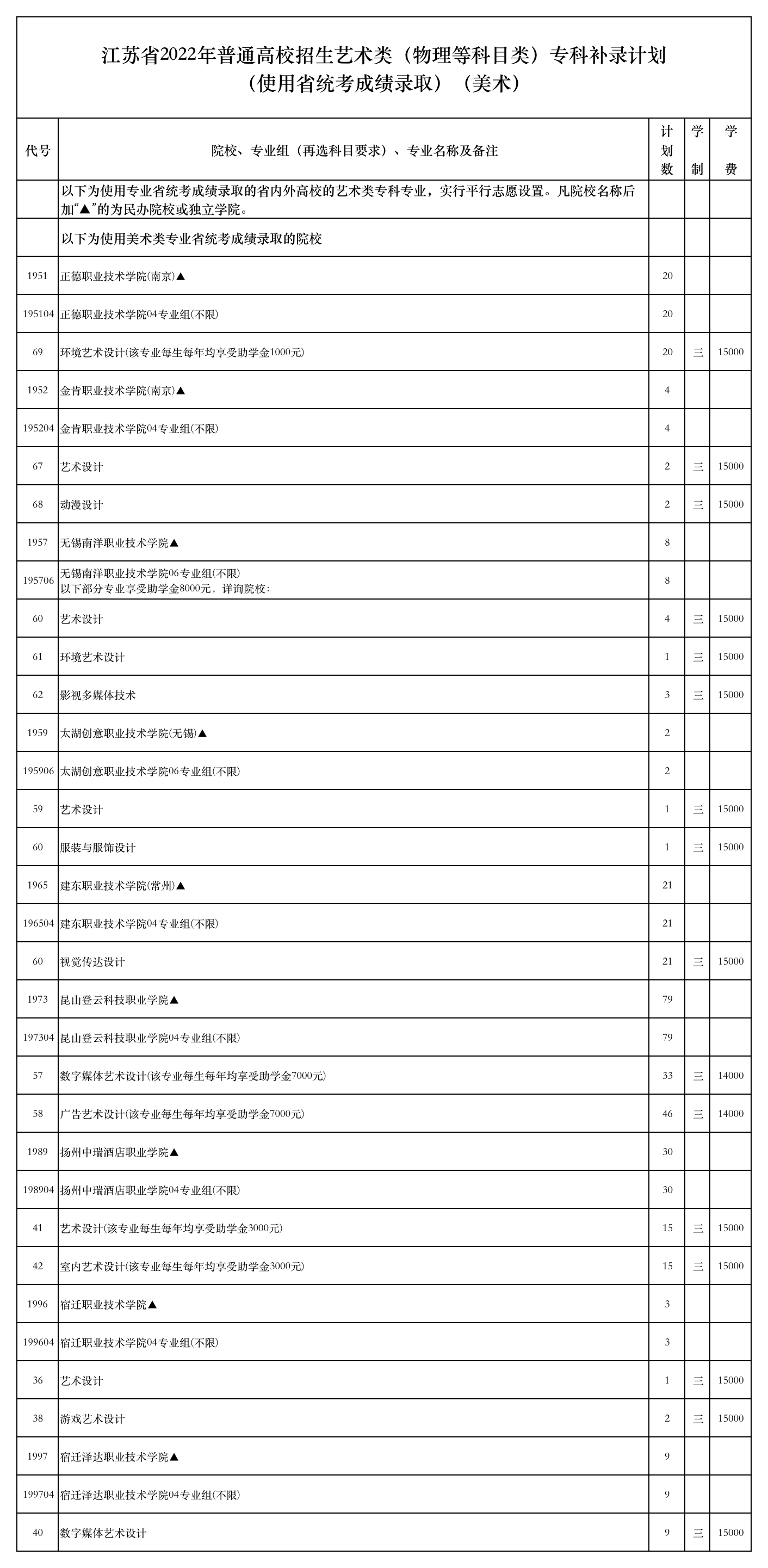 江苏省2022年普通高校招生艺术类(历史等科目类)专科补录计划(使用省统考成绩录取)(美术)