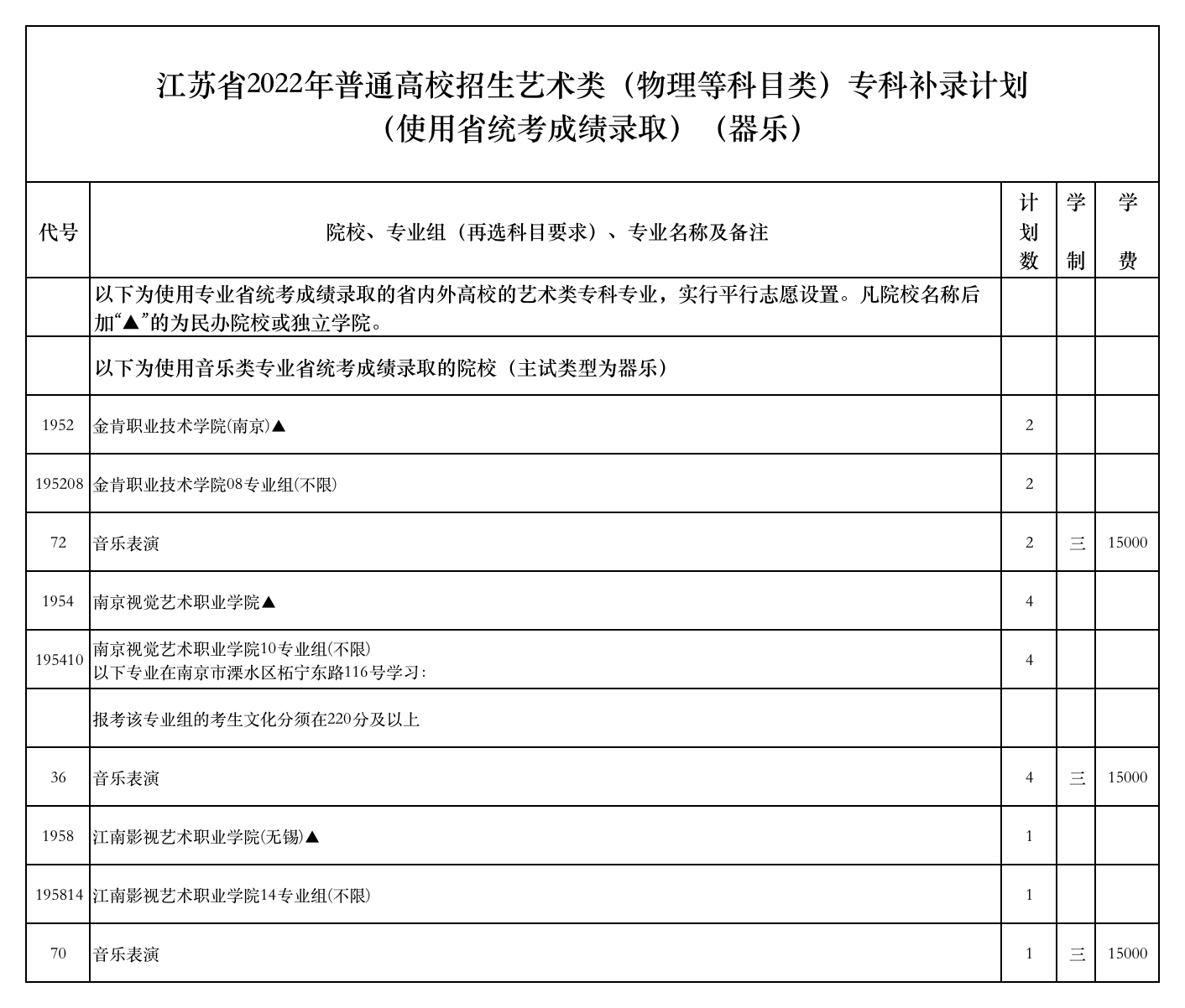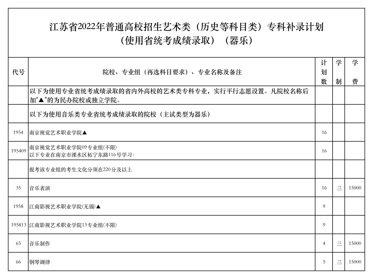 江苏省2022年普通高校招生艺术类(历史等科目类)专科补录计划(使用省统考成绩录取)(器乐)