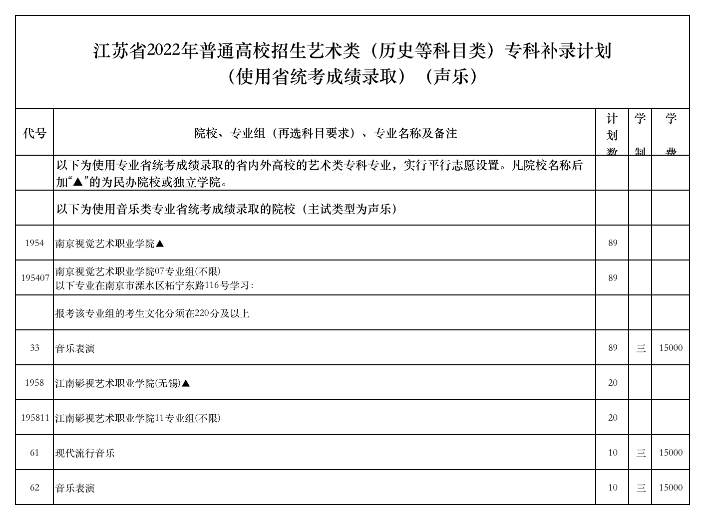 江苏省2022年普通高校招生艺术类(历史等科目类)专科补录计划(使用省统考成绩录取)(声乐)