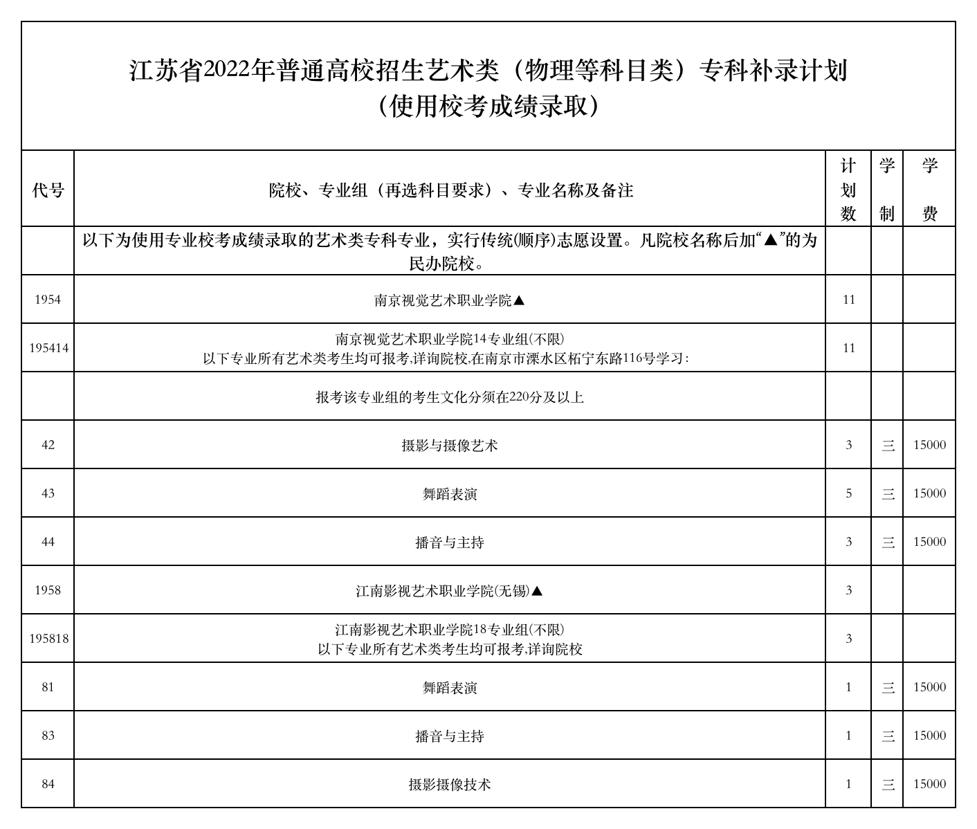 江苏省2022年普通高校招生艺术类(物理等科目类)专科补录计划(使用校考成绩录取)