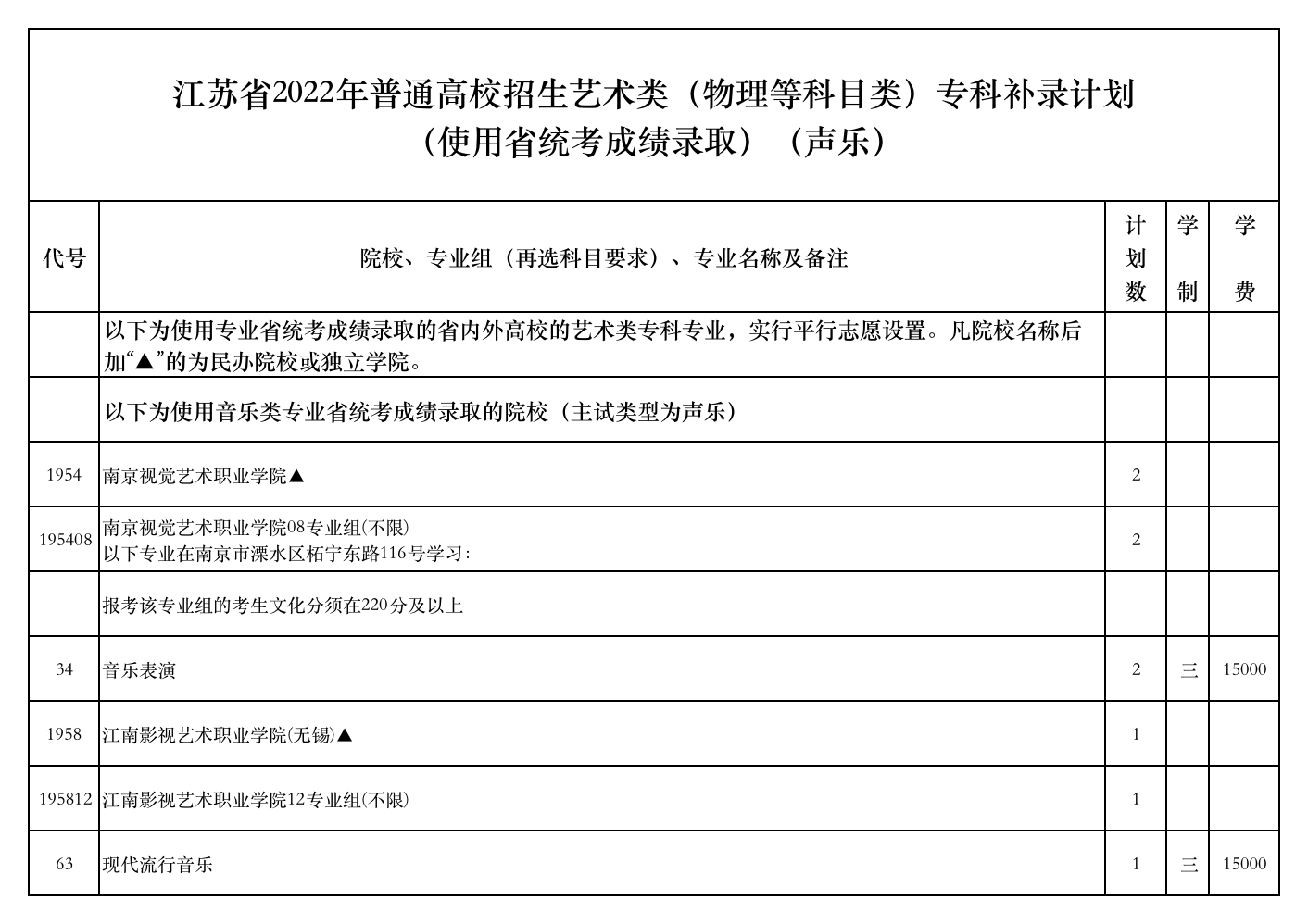 江苏省2022年普通高校招生艺术类(物理等科目类)专科补录计划(使用省统考成绩录取)(声乐)