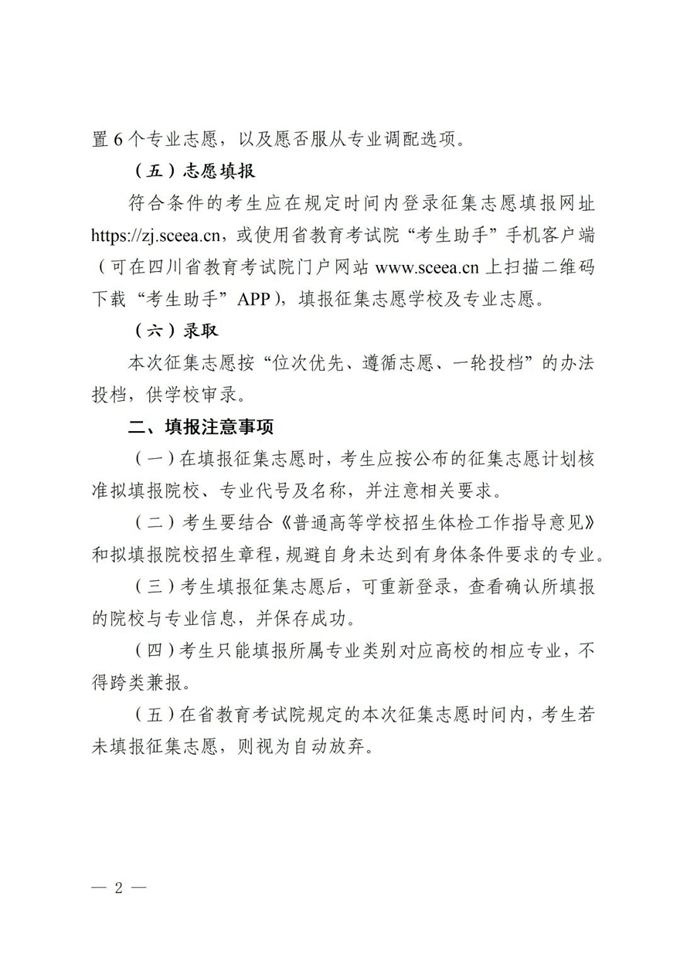 四川省2022年普通高校对口招生专科录取院校投档录取后,尚有部分院校招生计划未能完成,同时有部分院校新增计划。本次征集志愿时间为:8月15日10:00-16日10:00。本次征集志愿对象为普通高校对口招生对应专业类别省定专科录取控制分数线以上未被录取考生。或者省教育考试院发布的未录取考生库,为“自由可投”状态的考生;征集志愿投档时对不是“自由可投”状态的考生即使填报了征集志愿也不再投档。点击查看附件:2022年普通高校对口招生专科批征集志愿院校、专业及名额