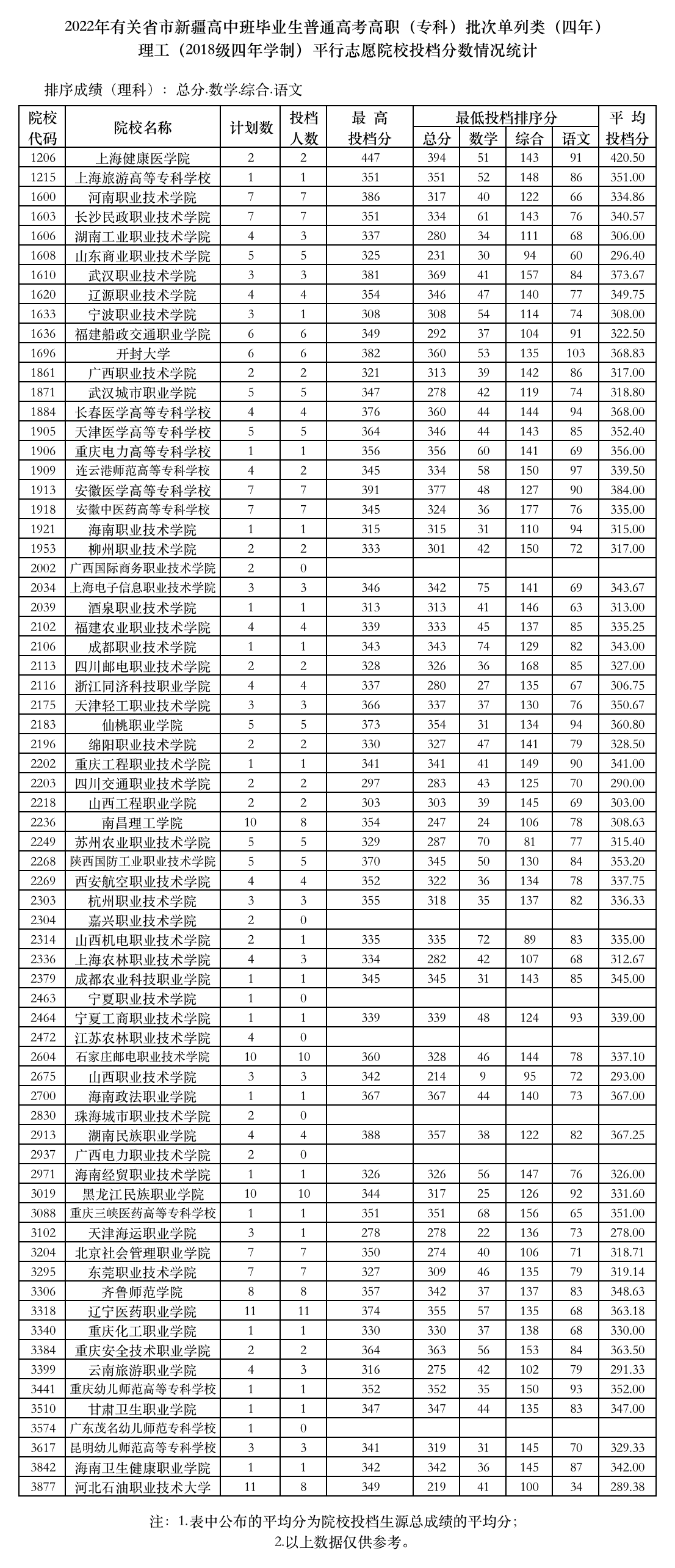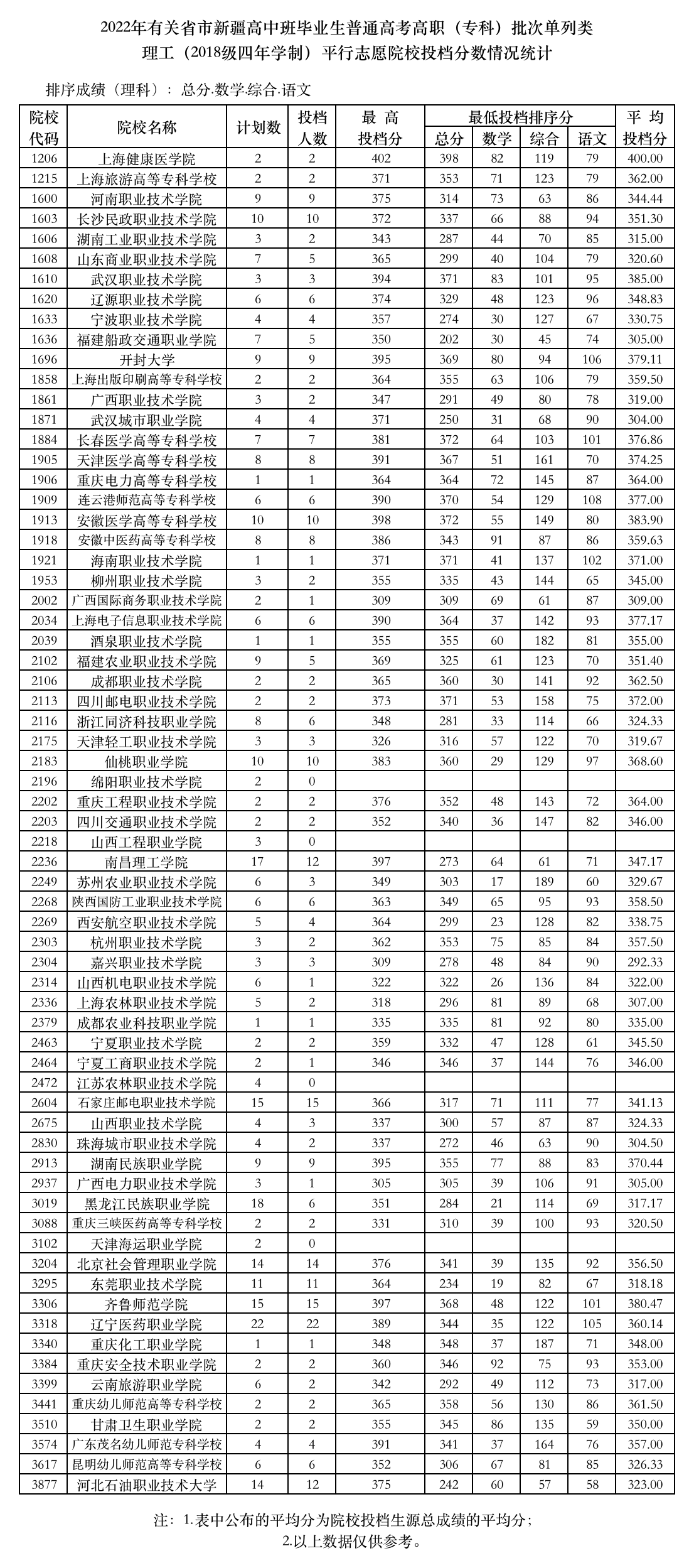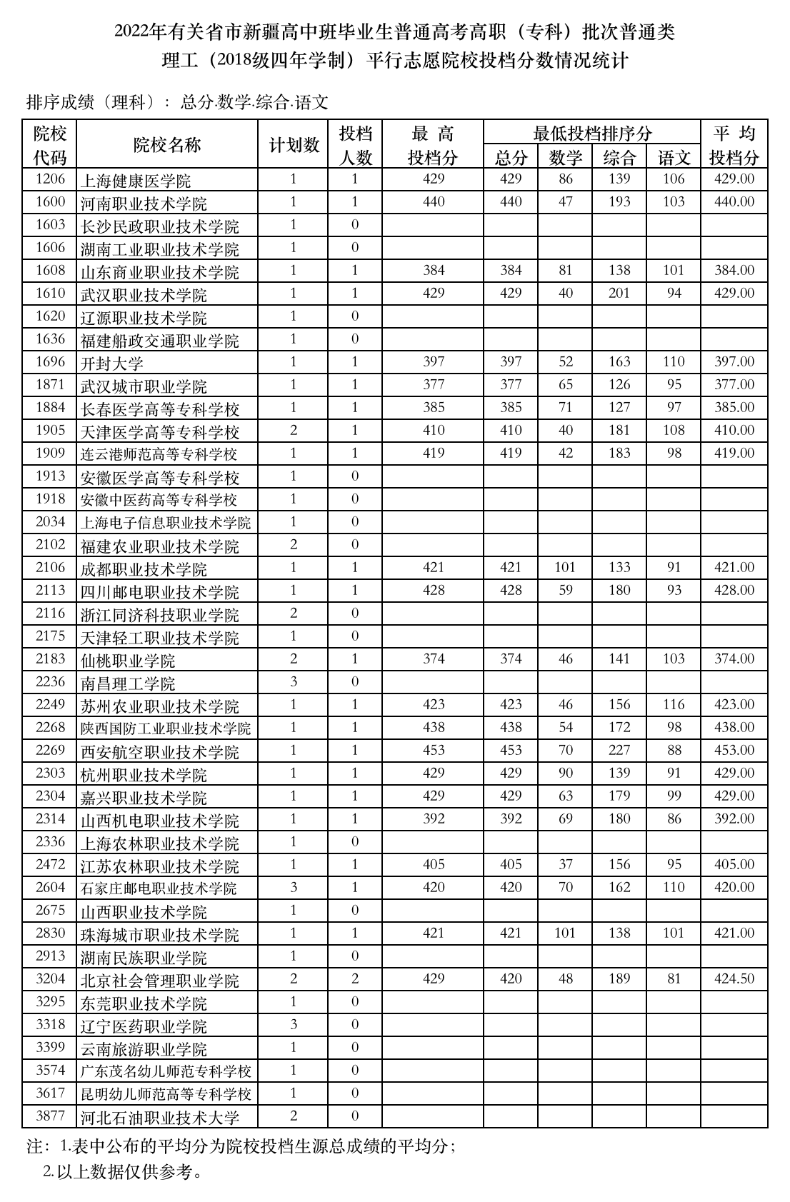 2022年有关省市新疆高中班毕业生普通高等学校招生录取生源情况统计表-普通类理工2018级四年学制高职(专科)批次