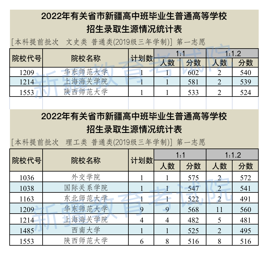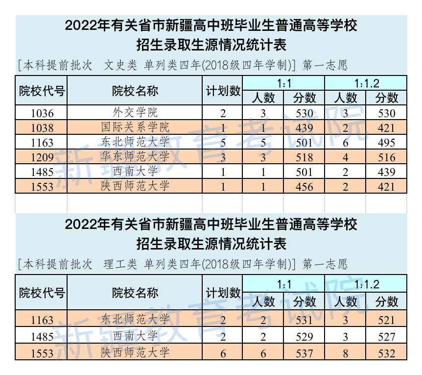 2022年有关省市新疆高中班毕业生普通高等学校招生本科提前批次录取生源情况统计表公布!