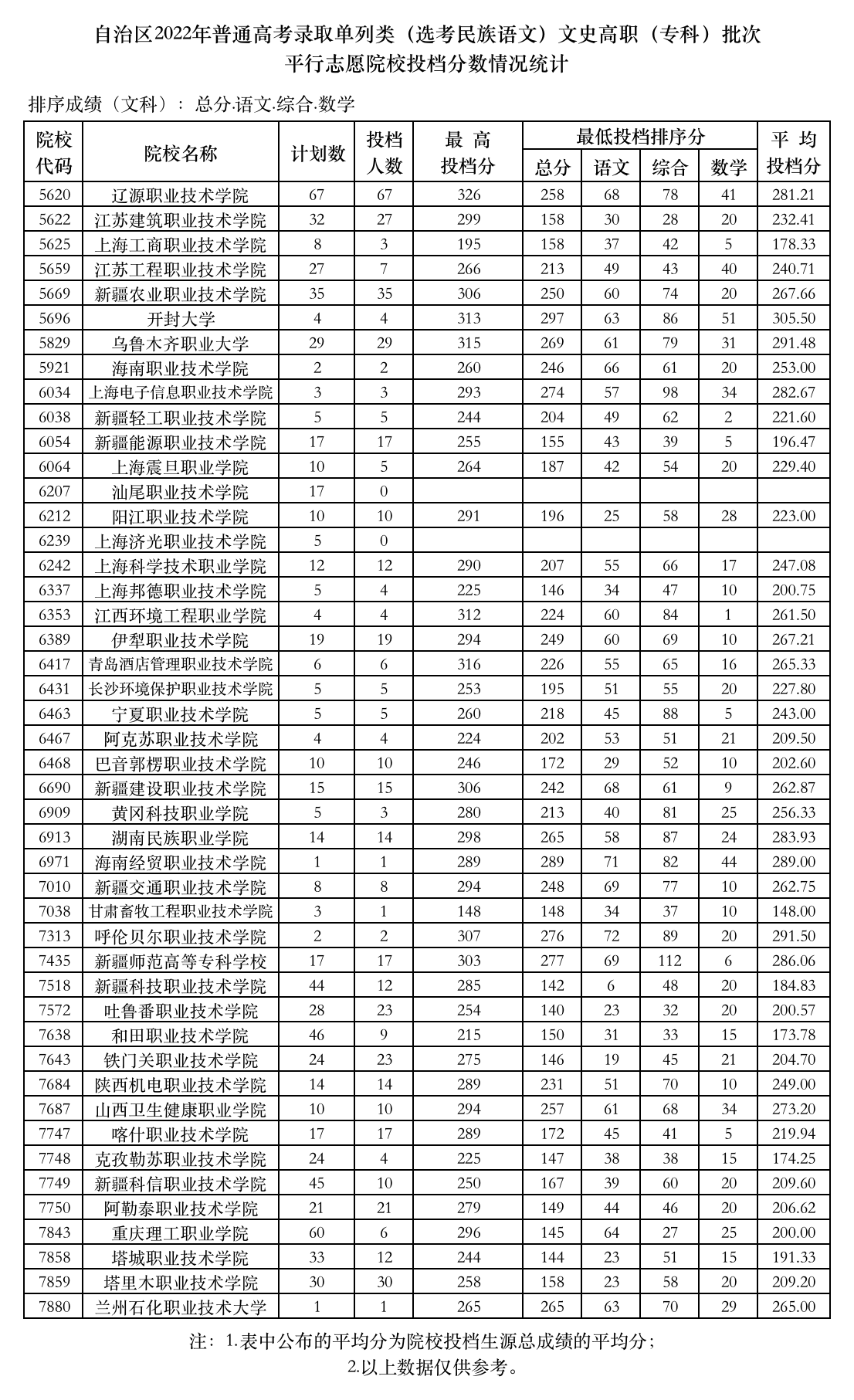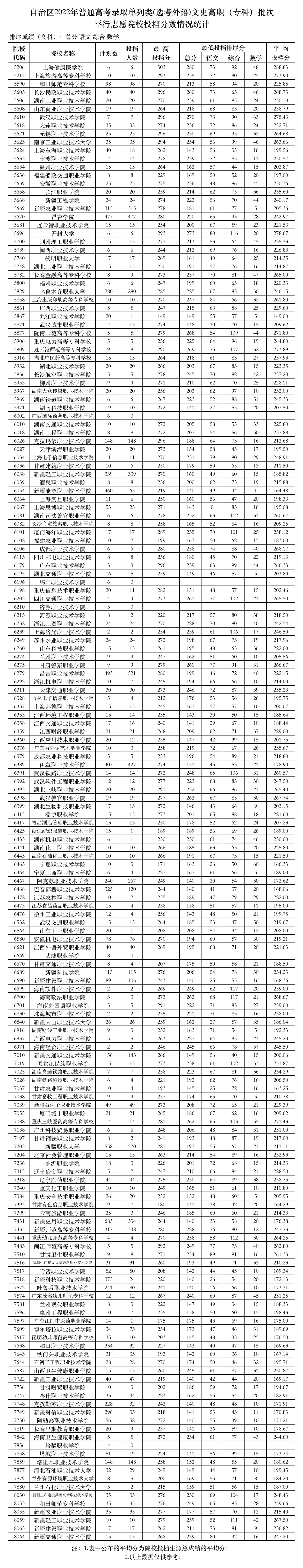 新疆维吾尔自治区2022年普通高校招生投档情况统计-普通类文史高职(专科)批次