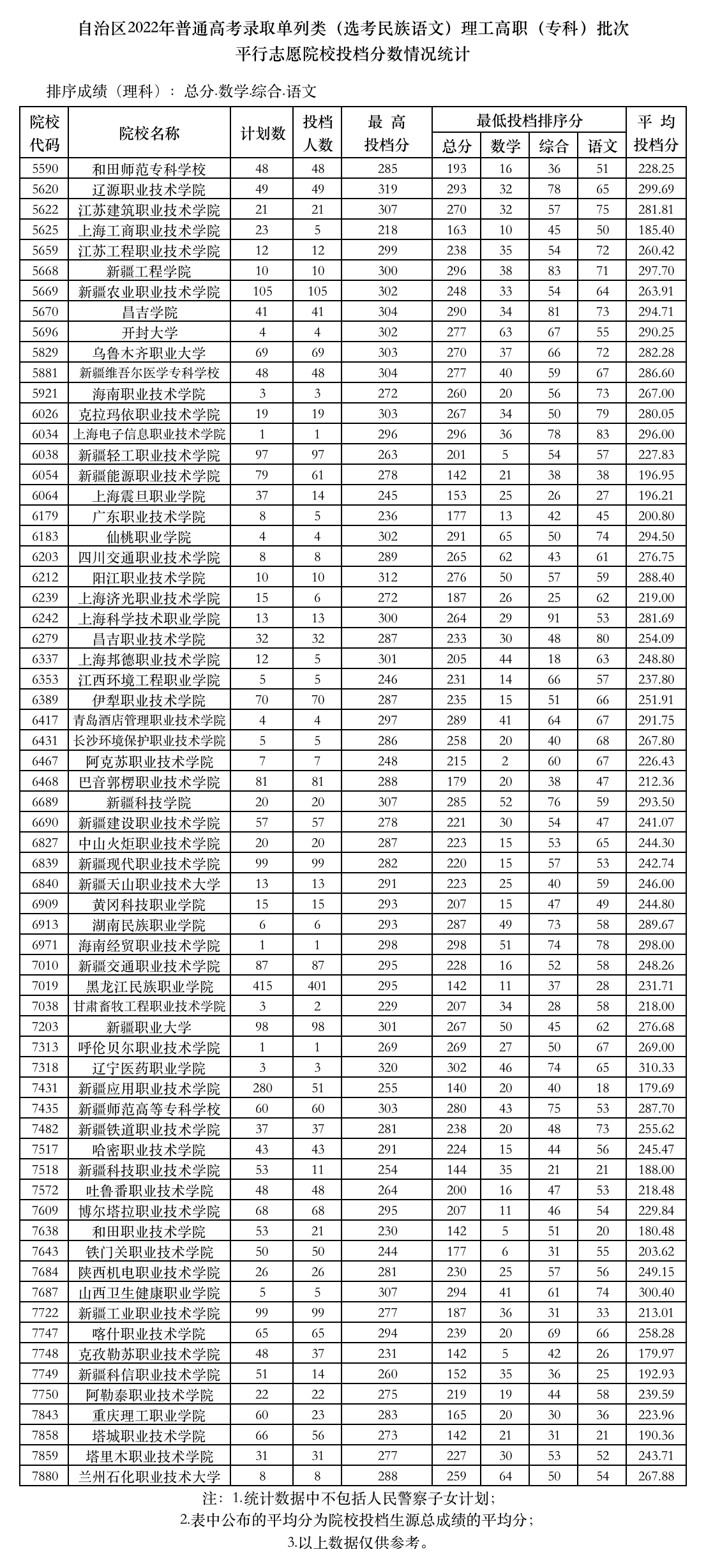 新疆维吾尔自治区2022年普通高校招生投档情况统计-单列类(选考民族语文)理工高职(专科)批次