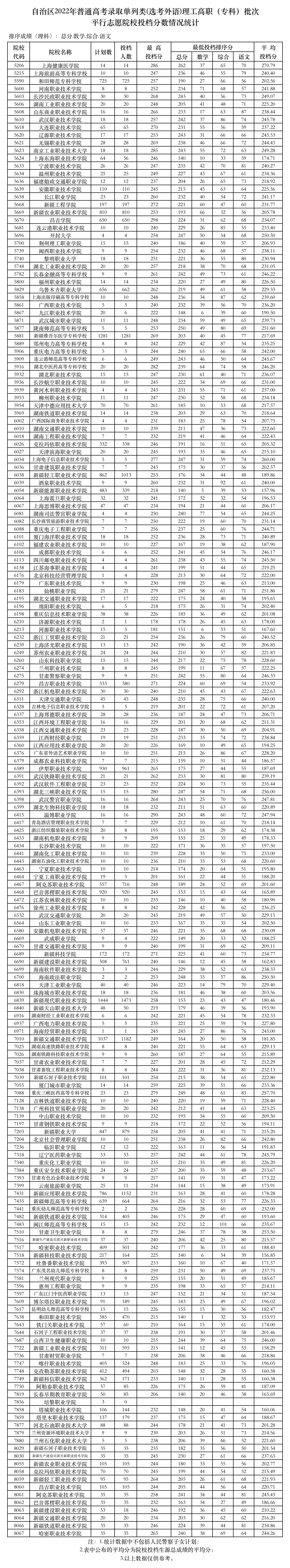 新疆维吾尔自治区2022年普通高校招生高职(专科)批次投档情况统计如下: