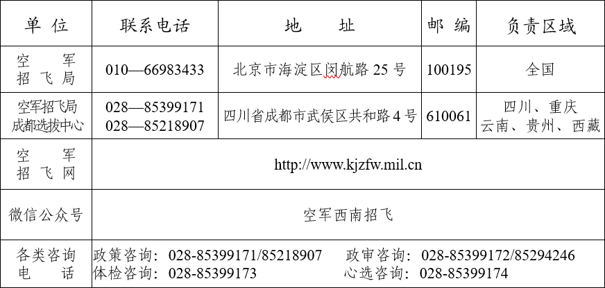 ★空军招收飞行学员政策规定,由空军招飞局负责解释。未尽事宜,请来电来函或登录空军招飞网、关注“空军西南招飞”微信公众号查询。