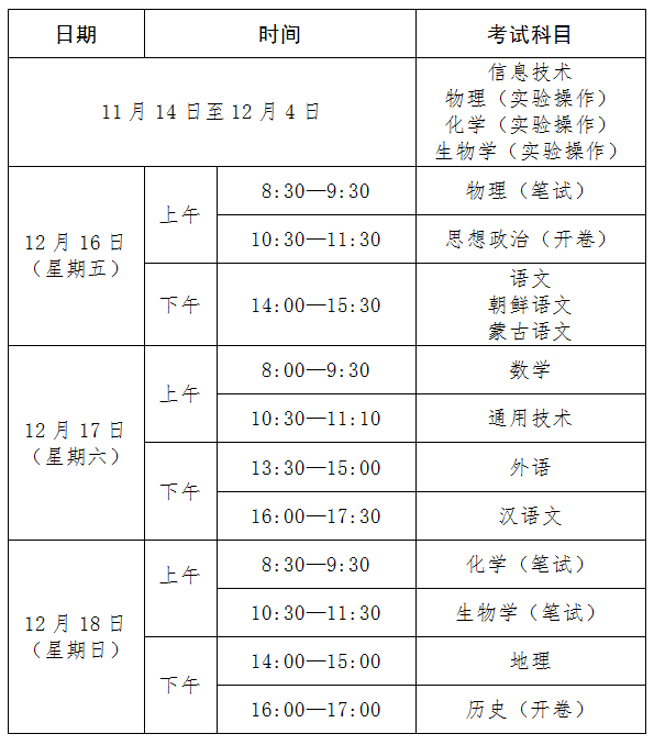 吉林:2022年下半年普通高中学业水平合格性考试日程表