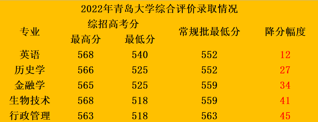 从青岛大学2022年高考综评录取与常规批录取情况来看,各专业降分幅度从12分-45分不等,如此大的分差对于想要报考青岛大学这些专业的同学来讲是一个福音无疑,其余各高校绝大多数降分幅度都较大,非常建议各位家长给孩子准备。