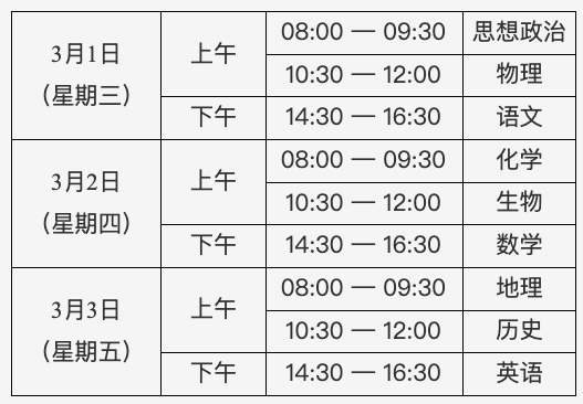 2023年第一次普通高中学业水平合格性考试将于3月1、2、3日(周三、四、五)举行,一起来看看考试时间表吧!