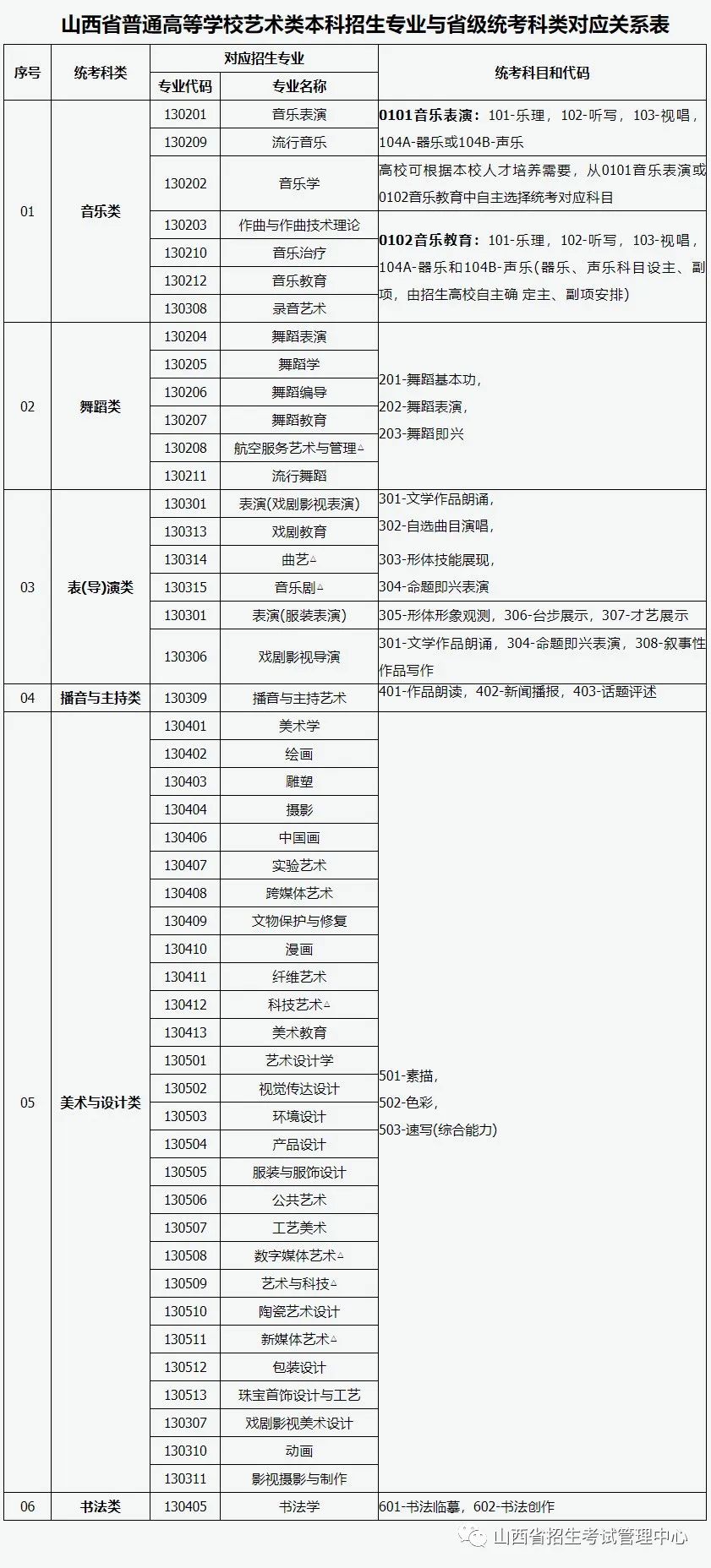 山西:高等学校招生委员会关于印发《山西省普通高等学校艺术类本科招生专业与省级统考科类对应关系》的通知