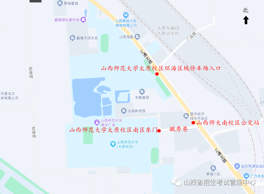 乘坐公共交通工具(901、902、903等公交线路)的考生可在“山西师大南校区站”下车,经毓秀巷步行至山西师范大学太原校区南区东门进入校区,而后按照引导到达考试(面试)地点。