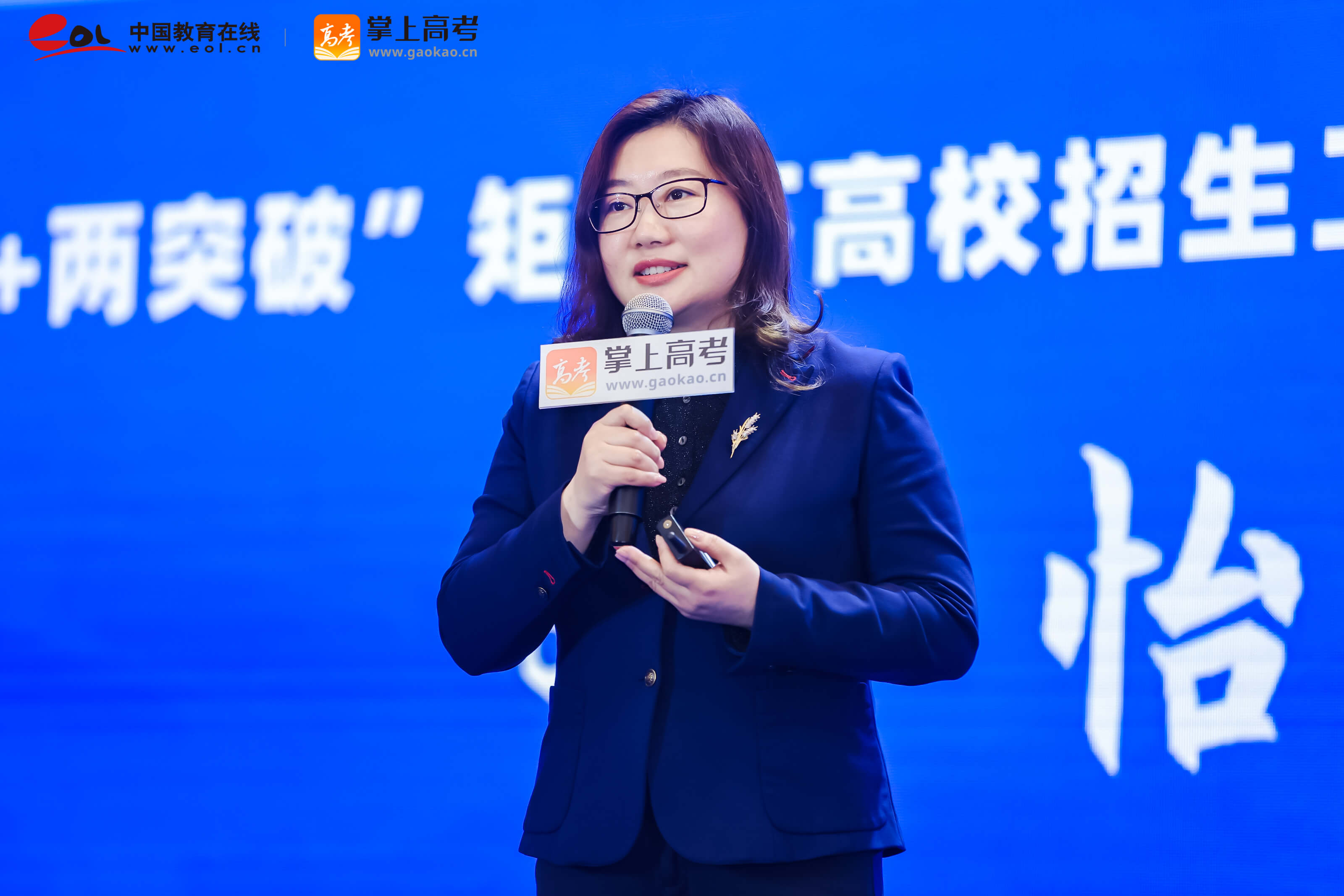 北京航空航天大学招生工作办公室主任邓怡以《“五度+两突破”矩阵下高校招生工作的实践和思考》为题进行了分享。她首先提出高校招生的一个根本问题,即选拔什么人,怎样选拔人,为谁选拔人。她表示,为高水平科技自立自强提供强大的人才支撑,是新时代下高校招生需要认真回答的重大问题。