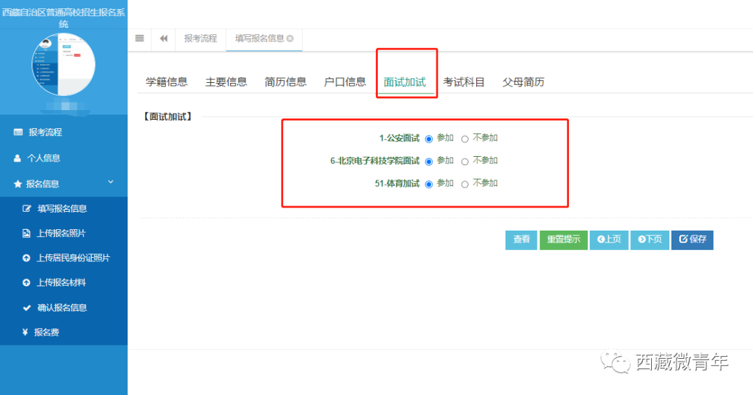(2)重要提示:报考公安、北京电子科技学院面试或体育加试的考生,必须在“面试加试”栏勾选参加相关院校组织的面试、体育加试。