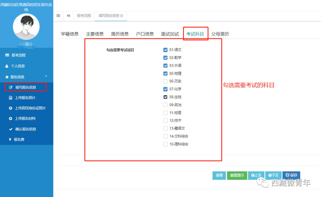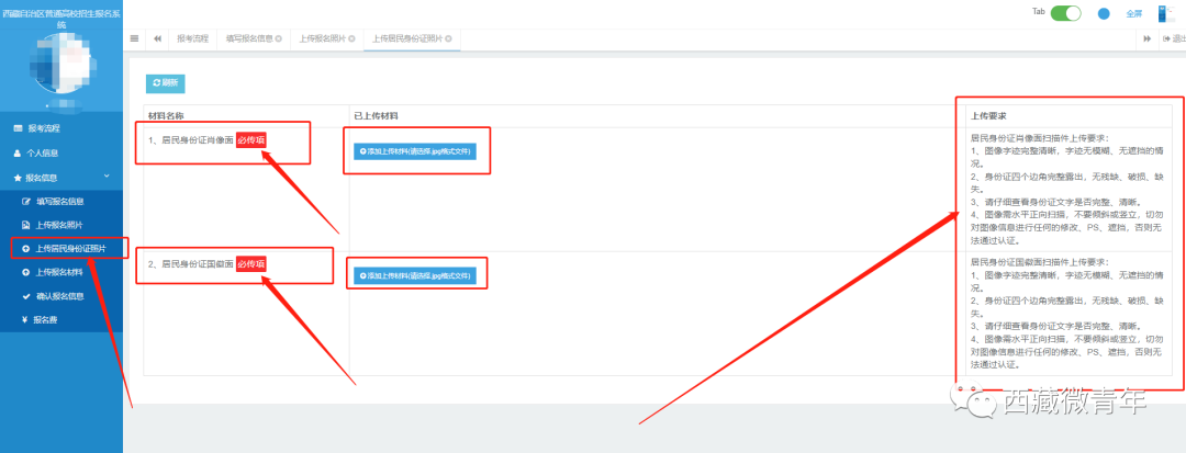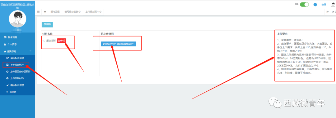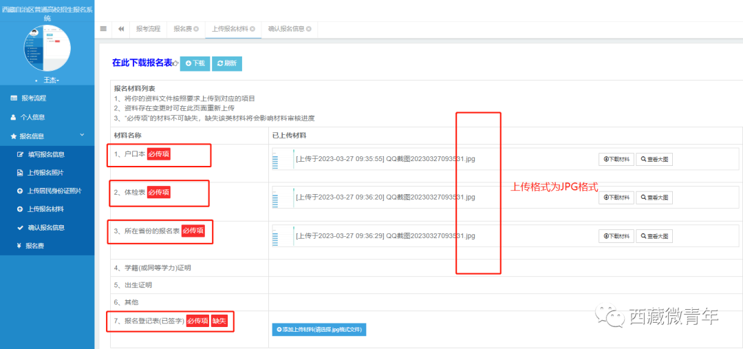 在“上传报名材料”页面,考生准备户口本、体检表、所在省份的报名表、2023年西藏班(校)普通高校招生报名登记表等清晰、可读的图片材料(上传格式为jpg格式),按要求上传相关材料。注意:不同情况考生,上传材料有所不同,考生须上传必传项材料。