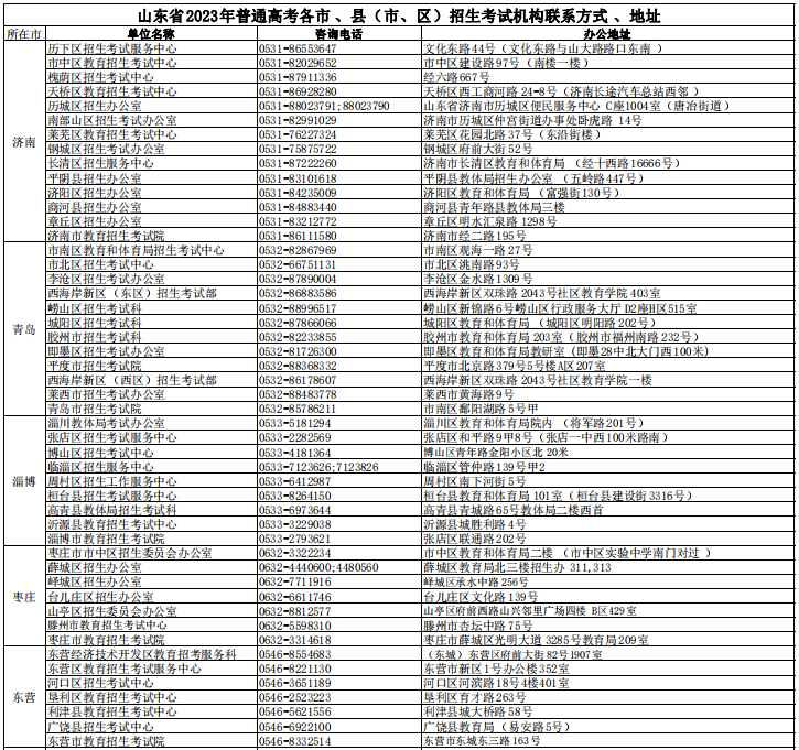 2.山东省2023年普通高考各市、县(市、区)招生考试机构联系方式、地址