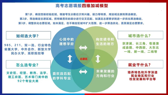 这灵魂4问完全可以参考高考志愿填报四维加减模型:即针对如何选大学、怎么选专业、城市选什么、就业干什么等四个问题维度,不断筛选匹配志愿交集区。“加减法”即在志愿交集区中根据“喜欢的做加法,不喜欢的做减法,不确定的先保留”原则进一步筛选确定志愿组合。