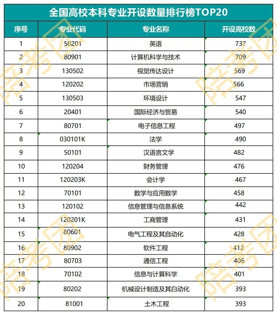 如下图,全国高校本科专业开设数量排行榜TOP20中,英语以737所开设高校数排列第一。作为专业最多、招生人数最多、就业岗位最多的“三最工学”,在本科招生的14个学科门类、92个专业类、771个专业中,工学门类包括31个专业类、260个专业,各占到1/3,招生人数基本占到了所有本科招生人数的35%。
