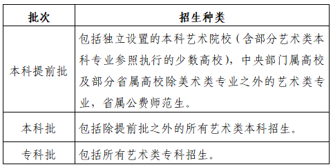 艺术类分为本科提前批、本科批和专科批三个录取批次,录取工作按三个批次依次进行。各批次包含的类型为: