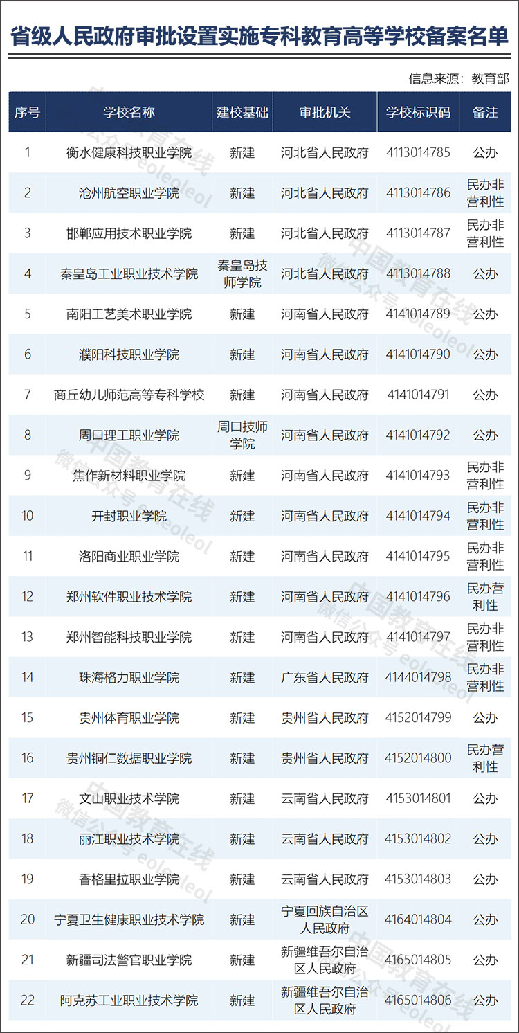 温馨提示:2023年高考进入倒计时,点击下载掌上高考app,获取各省历年真题、真题答案、详细解析。查分数、查专业、一键填报志愿。助力高考,金榜题名!教育部官网发布《关于公布2023年度第一批实施专科教育高等学校备案名单的函》,公布了省级人民政府审批设置的实施专科教育高等学校备案名单。名单上共有22所高校。从地域看,其中位于河南省的数量最多,共有9所;其次是河北省,共有4所;此外,云南、贵州、新疆、宁夏、广东等地也各有1-3所不等。具体名单如下: